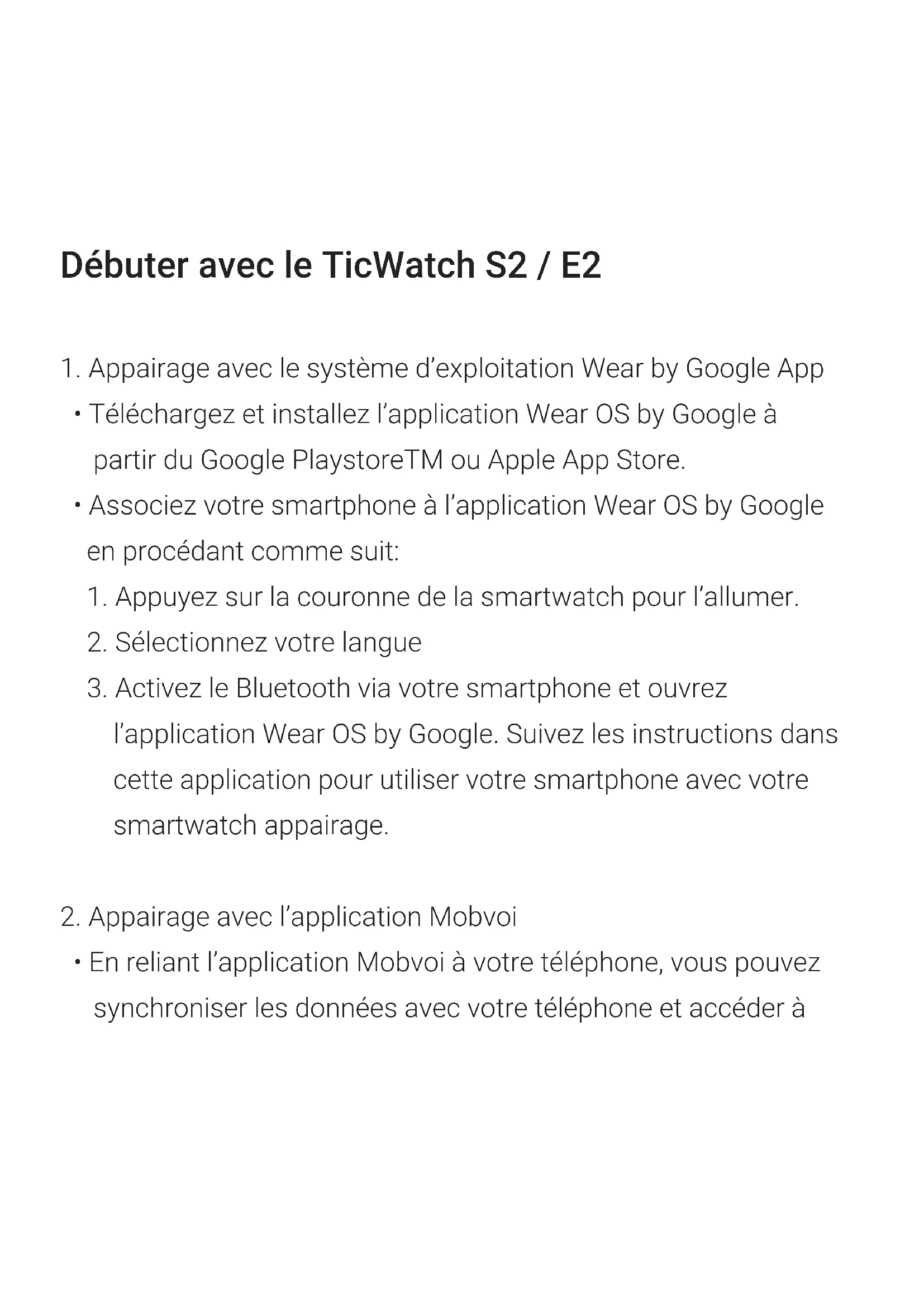 - En reliant l’application Mobvoi à votre téléphone, vous pouvez synchroniser les données avec votre téléphone et accéder àDébuter avec le TicWatch S2 / E2 d’autres fonctions.