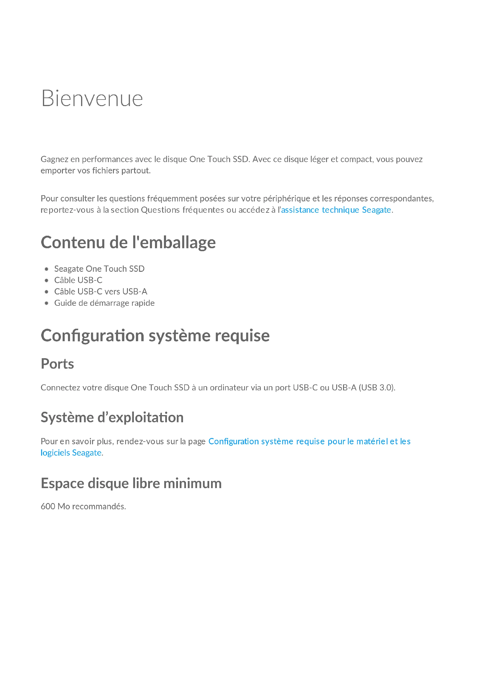 21Bienvenue Gagnez en performances avec le disque One Touch SSD. Avec ce disque léger et compact, vous pouvez emporter vos fichiers partout. Pour consulter les questions fréquemment posées sur votre périphérique et les réponses correspondantes, reportez-vous à la section Questions fréquentes ou accédez à l’assistance technique Seagate. Contenu de l'emballage Seagate One Touch SSD Câble USB-C Câble USB-C vers USB-A Guide de démarrage rapide Configuraon système requise Ports Connectez votre disque One Touch SSD à un ordinateur via un port USB-C ou USB-A (USB 3.0). Système d’exploitaon Pour en savoir plus, rendez-vous sur la page Configuration système requise pour le matériel et les logiciels Seagate. Espace disque libre minimum 600 Mo recommandés.Mise en route Enregistrez le disque Seagate One Touch SSD pour commencer à synchroniser des fichiers d’ordinateurs PC/Mac et d’appareils mobiles Android compatibles. Ordinateurs PC/Mac Connectez le disque One Touch SSD à votre ordinateur et utilisez Seagate Toolkit pour synchroniser des dossiers afin que vos fichiers soient accessibles aux deux endroits. Pour éviter toute perte de données, laissez Toolkit copier automatiquement les fichiers que vous avez supprimés dans le dossier d'archivage du disque One Touch SSD. Appareils mobiles Android Connectez le disque One Touch SSD à un appareil mobile Android compatible et utilisez l'application Seagate SSD Touch pour sauvegarder, déplacer, copier et supprimer des fichiers sur le disque One Touch SSD et votre appareil mobile. Ordinateurs PC/Mac Connexion du câble USB Utilisez le câble USB-C si votre ordinateur est équipé d'un port USB-C. Si votre ordinateur n’est pas équipé d'un port USB-C, utilisez le câble USB-C vers USB-A.Configuraon du disque One Touch SSD Dans le cadre du processus de configuration, vous pouvez : Enregistrer le disque Seagate One Touch SSD Accédez aux informations et à l’aide mises à votre disposition pour exploiter pleinement votre périphérique. Installer Toolkit Configurez des plans de synchronisation, etc. Start Here Pour enregistrer votre périphérique et installer Toolkit, votre ordinateur doit être connecté à Internet. À l’aide d'un gestionnaire de fichiers tel que l’Explorateur de fichiers ou le Finder, ouvrez One Touch et lancez Start Here Win ou Start Here Mac. Enregistrer le périphérique Renseignez les informations demandées et cliquez sur Enregistrer. Télécharger ToolkitCliquez sur le bouton Télécharger. Installaon de Toolkit À l’aide d'un gestionnaire de fichiers tel que l’Explorateur de fichiers ou le Finder, accédez au dossier des téléchargements. Cliquez sur le fichier SeagateToolkit.exe pour lancer l'application. Ouvrez le fichier SeagateToolkit.zip. Cliquez sur le programme d'installation de Seagate Toolkit pour lancer l’application. Appareils mobiles Android Pour installer et mettre à jour Toolkit, votre ordinateur doit être connecté à Internet. Étape 1 : Téléchargement de Seagate SSD Touch Ouvrez Google Play Store sur votre appareil mobile Android et téléchargez l'application Seagate SSD Touch. Pour ouvrir Google Play Store, vous pouvez également scanner le code QR suivant avec votre appareil Android : Étape 2 : Connexion de votre appareil mobile Android Utilisez le câble USB-C pour raccorder le disque One Touch SSD à votre appareil mobile. Étape 3 : Lancement de Seagate SSD Touch Après avoir téléchargé SSD Touch et connecté le disque Seagate One Touch SSD à votre appareil mobile Android, ouvrez l'application et suivez les instructions qui s'affichent à l'écran pour enregistrer le disque et commencer à sauvegarder des fichiers. Pour lancer la procédure d’installation, votre appareil mobile Android doit être connecté à Internet.