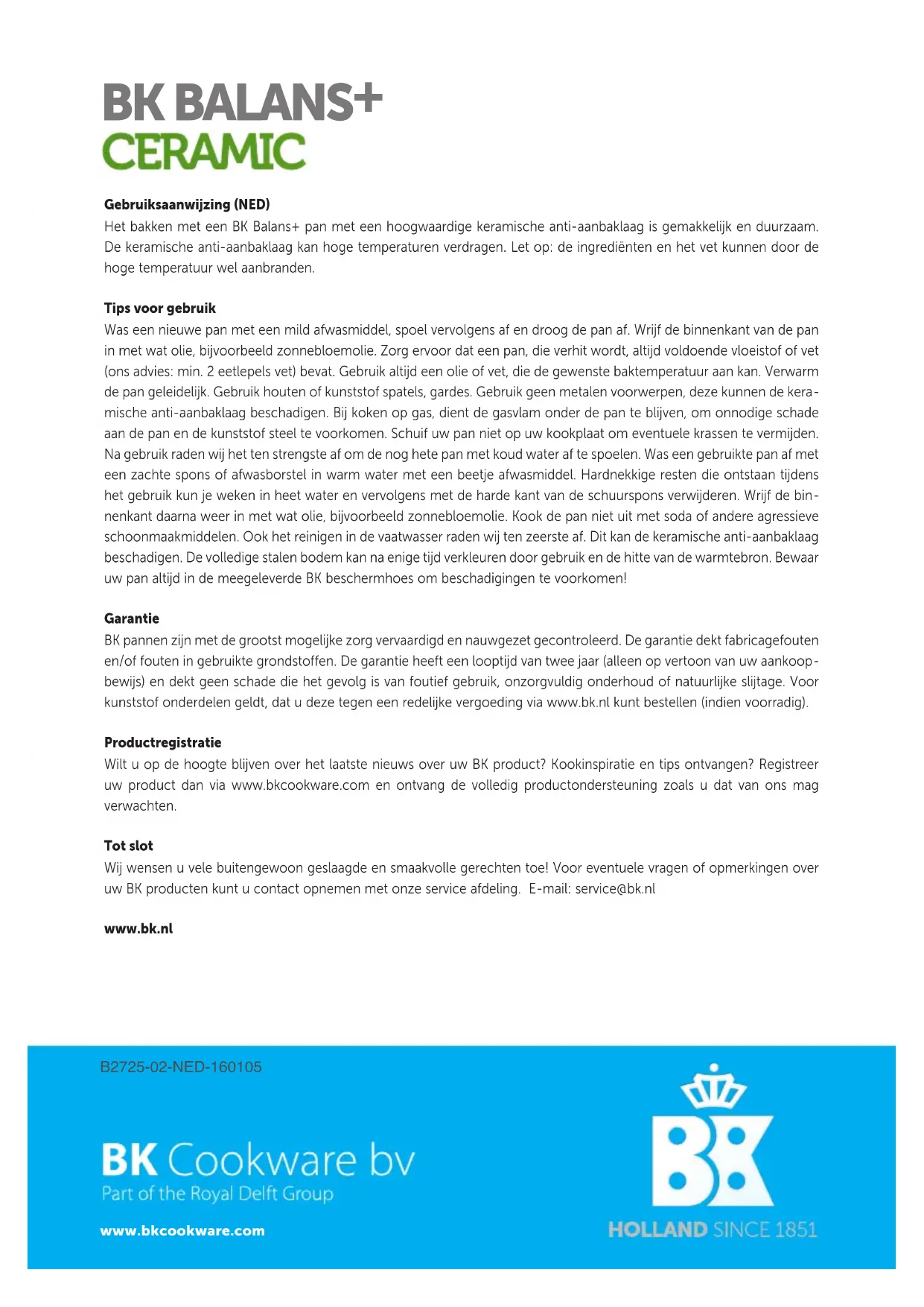 Nous espérons que ces casseroles vous permettront de réussir des plats d'un gout exceptionnel ! Pour toute question ou remarque concernant vos produits de BK, vous pouvez vous adresser à notre service après-vente. E-mail: service@bk.nl