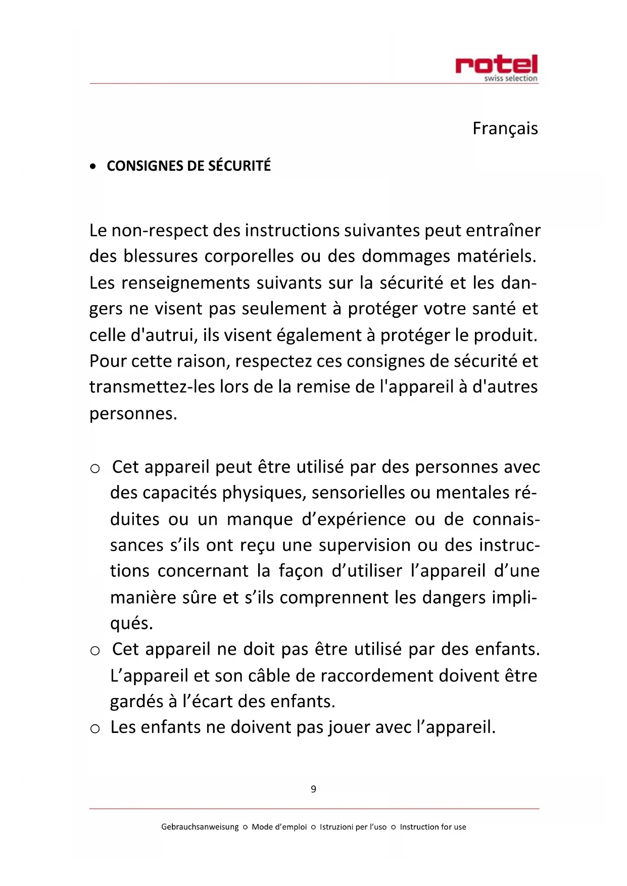 Pour une élimination dans les régles de l'art, veuilles remettre l'appareil à un reven-deur, un responsable du service après-vente ou Rotel SA.