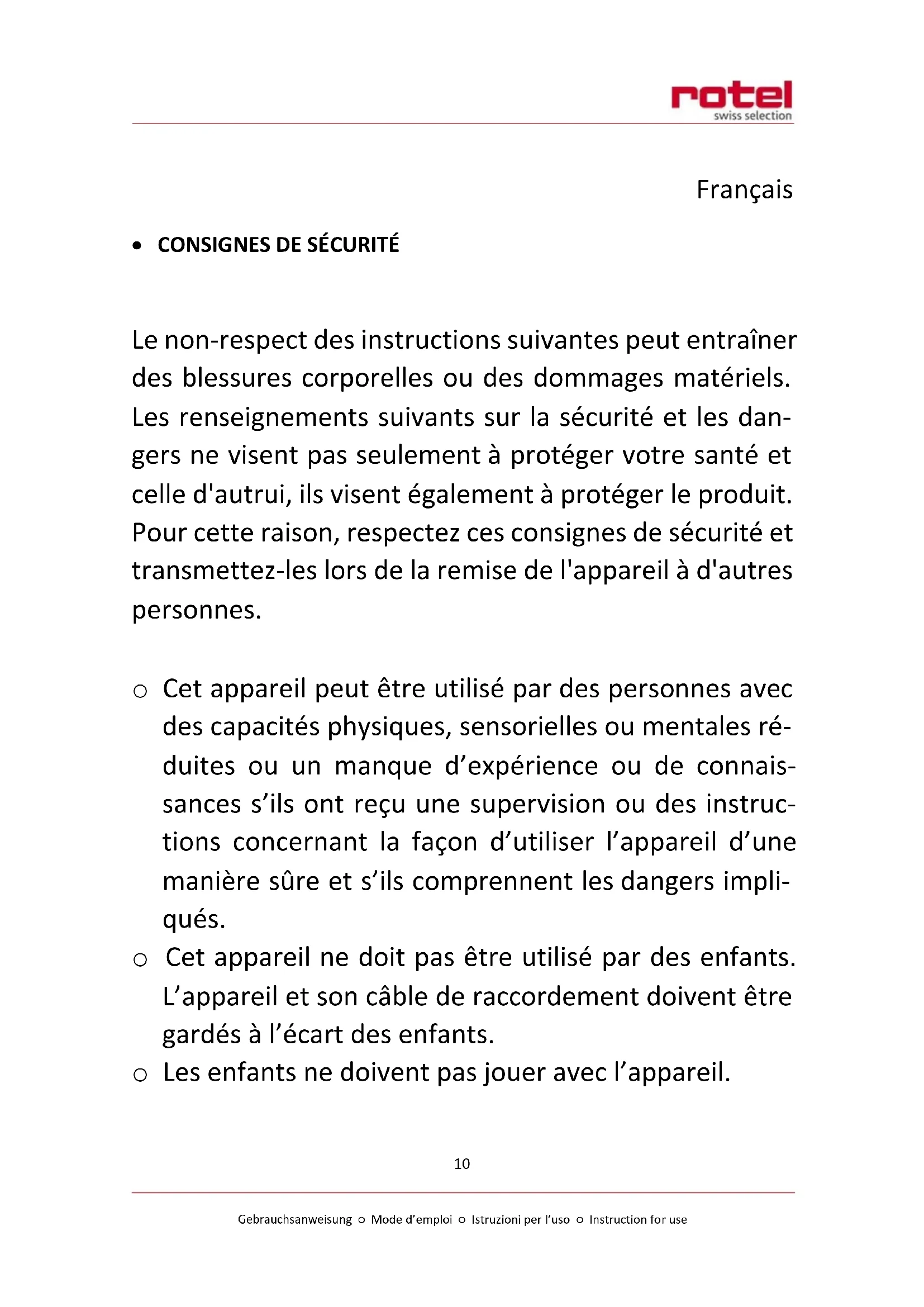 Pour une élimination dans les règles de l'art, veuillez remettre l'appareil à un revendeur, un responsable du service après-vente ou Rotel SA.