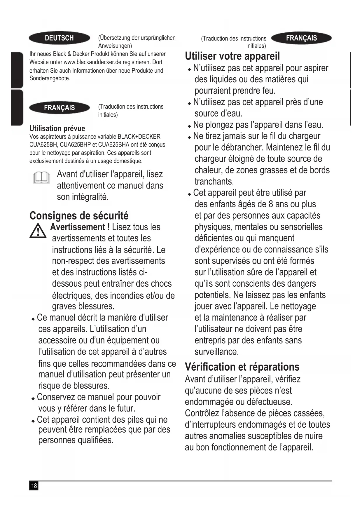 Tri sélectif. Les produits et batteries marqués de ce symbole ne doivent pas être jetés avec les déchets ménagers.Les produits et batteries contiennent des matières qui peuvent être récupérées et recyclées afin de réduire la demande en matières premières.Veillez à recycler les produits électriques et les piles et batteries conformément aux prescriptions locales en vigueur. Pour plus d’informations, consultez le site www.2helpU.comCaractéristiques techniquesCUA625BH CUA625BHP CUA625BHATension V 21.6 21.6 21.6Wat-theuresWh 54 54 54Poids Kg 4.35 4.35 4.35 Garantie Black & Decker est sûr de la qualité de ses produits et offre une garantie de 24 mois aux utilisateurs, à partir de la date d’achat. Cette garantie s’ajoute à vos droits légaux auxquels elle ne porte aucunement préjudice. Cette garantie est valable au sein des territoires des États membres de l’Union Européenne et au sein de la Zone européenne de libre-échange.Pour prétendre à la garantie, la réclamation doit être conforme aux conditions générales de Black & Decker et vous devez fournir une preuve d’achat au vendeur ou au réparateur agréé. Les conditions générales de la garantie de 2 ans Black & Decker ainsi que l’adresse du réparateur agrée le plus proche sont disponibles sur le site Internet www.2helpU.com ou en contactant votre agence Black & Decker locale à l’adresse indiquée dans ce manuel.Veuillez consulter notre site web www.blackanddecker.co.uk pour enregistrer votre nouveau produit Black & Decker et pour être tenu informé des nouveaux produits et des offres spéciales.(Traduzione del testo originale)ITALIANO Uso previsto Gli aspirapolvere a potenza variabile BLACK+DECKER CUA625BH, CUA625BHP e CUA625BHA sono stati progettati per scopi di pulizia tramite aspirazione. Questi apparecchi sono concepiti esclusivamente per uso domestico. Leggere attentamente Questo manuale prima di usare l'appar- ecchio. Istruzioni di sicurezza