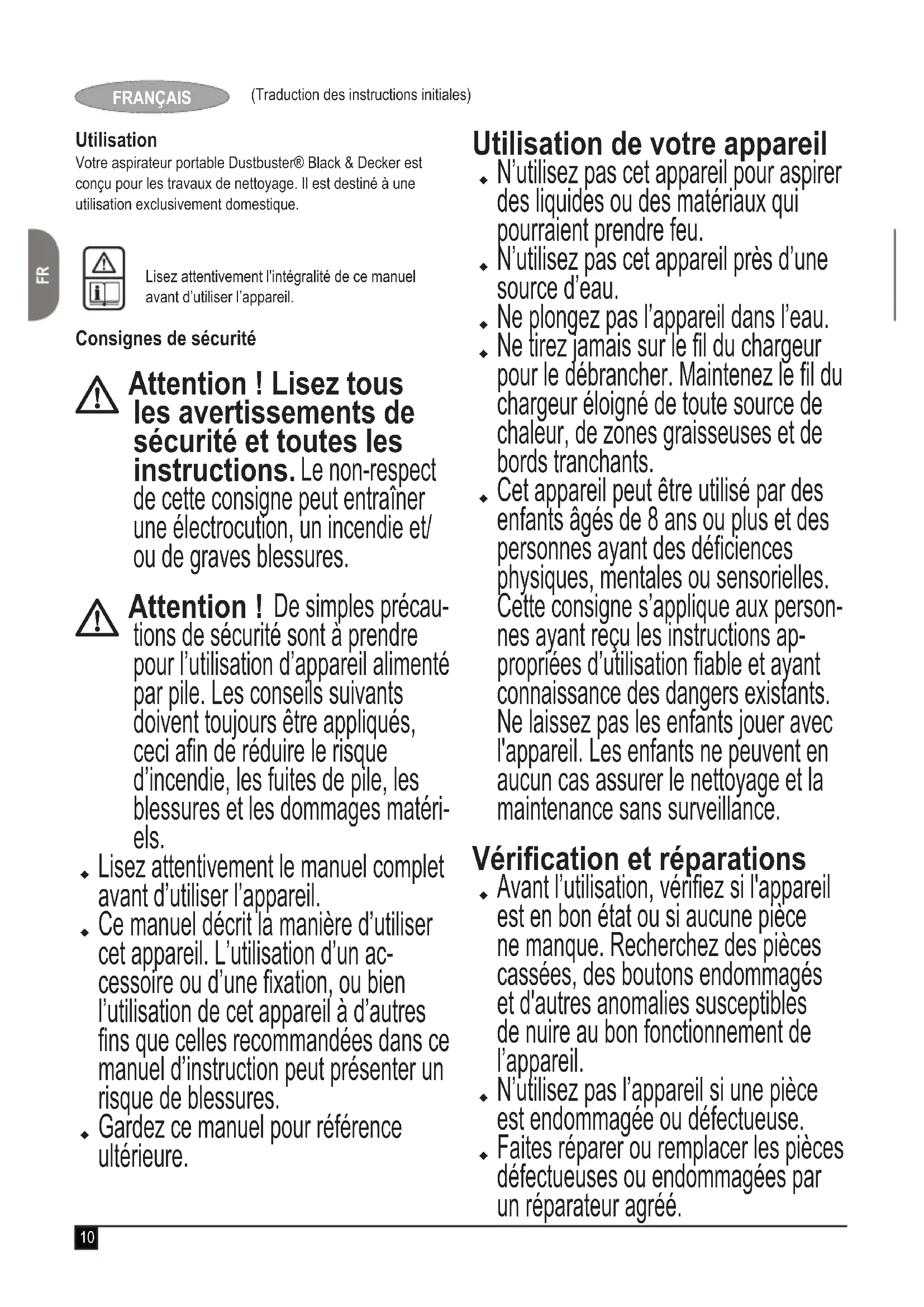 Attention ! De simples précau- tions de sécurité sont à prendre pour l’utilisation d’appareil alimenté par pile. Les conseils suivants doivent toujours être appliqués, ceci an de réduire le risque d’incendie, les fuites de pile, les blessures et les dommages matéri- els. Lisez attentivement le manuel complet avant d’utiliser l’appareil. Ce manuel décrit la manière d’utiliser cet appareil. L’utilisation d’un ac- cessoire ou d’une xation, ou bien l’utilisation de cet appareil à d’autres ns que celles recommandées dans ce manuel d’instruction peut présenter un risque de blessures. Gardez ce manuel pour référence ultérieure. Utilisation de votre appareil N’utilisez pas cet appareil pour aspirer des liquides ou des matériaux qui pourraient prendre feu. N’utilisez pas cet appareil près d’une source d’eau. Ne plongez pas l’appareil dans l’eau. Ne tirez jamais sur le l du chargeur pour le débrancher. Maintenez le l du chargeur éloigné de toute source de chaleur, de zones graisseuses et de bords tranchants. Cet appareil peut être utilisé par des enfants âgés de 8 ans ou plus et des personnes ayant des déciences physiques, mentales ou sensorielles. Cette consigne s’applique aux person- nes ayant reçu les instructions ap- propriées d’utilisation able et ayant connaissance des dangers existants. Ne laissez pas les enfants jouer avec l'appareil. Les enfants ne peuvent en aucun cas assurer le nettoyage et la maintenance sans surveillance. Vérication et réparations Avant l’utilisation, vériez si l'appareil est en bon état ou si aucune pièce ne manque. Recherchez des pièces cassées, des boutons endommagés et d'autres anomalies susceptibles de nuire au bon fonctionnement de l’appareil. N’utilisez pas l’appareil si une pièce est endommagée ou défectueuse. Faites réparer ou remplacer les pièces défectueuses ou endommagées par un réparateur agréé.11 (Traduction des instructions initiales) FRANÇAIS Vériez régulièrement l’état du l du chargeur. Si le l est endommagé ou défectueux, remplacez le chargeur. Ne tentez jamais de retirer ou de rem- placer des pièces autres que celles citées dans ce manuel. Consignes de sécurité supplémentaires Après l’utilisation Débranchez le chargeur pour le net- toyer ou pour nettoyer la base. Quand il n’est pas utilisé, l’appareil doit être rangé dans un endroit sec. Les enfants ne doivent pas avoir accès aux appareils rangés. Risques résiduels. L'utilisation d'une machine non mention- née dans les consignes de sécurité don- nées peut entraîner des risques résiduels supplémentaires. Ces risques peuvent survenir si l'appareil est mal utilisé, si l'utilisation est prolongée, etc. Malgré l'application des normes de sécurité correspondantes et la présence de dispositifs de sécurité, les risques résiduels suivants ne peuvent être évités. Ceci comprend : Les blessures dues au contact avec une pièce mobile/en rotation. Les blessures causées en changeant des pièces, lames ou accessoires. Les blessures dues à l'utilisation prolongée d'un outil. L'utilisation pro- longée d'un outil nécessite des pauses régulières. Décience auditive. Risques pour la santé causés par l'inhalation de poussières produites pendant l'utilisation de l'outil (exem- ple : travail avec du bois, surtout le chêne, le hêtre et les panneaux en MDF). Batteries et chargeurs Batteries En aucun cas, n’essayez d’ouvrir l’outil. Ne mettez pas la batterie en contact avec l’eau. N'approchez pas la batterie d'une source de chaleur. Ne le rangez pas dans des endroits où la température peut dépasser 40 °C. Ne chargez qu’à température ambi- ante comprise entre 10 °C et 40 °C. N’utilisez que le chargeur fourni avec l’appareil. Le non respect de cette consigne pourrait entraîner un électro- traumatisme ou une surchauffe de la batterie. Pour la mise au rebut des batter- ies, suivez les instructions don- nées dans la section "Protection de l’environnement". Ne déformez/n’endommagez pas le bloc batterie en le perçant ou en le cognant, ceci pourrait entraîner des blessures et un incendie. Ne chargez pas les batteries endom- magées.12 (Traduction des instructions initiales) FRANÇAIS Dans des conditions extrêmes, une batterie peut couler. Si vous détectez une fuite, utilisez un chiffon pour es- suyer le liquide avec précaution. Évitez tout contact avec la peau. En cas de contact avec la peau ou les yeux, suivez les instructions ci-des- sous. Attention ! Le liquide de batterie peut provoquer des blessures ou des dom- mages. En cas de contact avec la peau, rincez immédiatement à l'eau. Si des rougeurs, une douleur ou une irritation se produisent, consultez un médecin. En cas de contact avec les yeux, rincez à l’eau et consultez immédiatement un médecin. Chargeurs Votre chargeur doit être utilisé avec une tension spécique. Vériez toujours si la tension indiquée sur la plaque sig- nalétique de l’appareil correspond à la tension de secteur. Attention ! N’essayez jamais de rem- placer le chargeur par une prise secteur. N’utilisez votre chargeur Black & Decker que pour charger la batterie fournie avec l’appareil. D'autres bat- teries pourraient exploser, provoquant des blessures et des dommages. Ne tentez jamais de recharger des bat- teries non rechargeables. Si le câble d'alimentation est endom- magé, il doit être remplacé par le fabricant ou par un centre de répara- tion agréé Black & Decker pour éviter tout risque. Ne mettez pas le chargeur en contact avec l'eau. N’ouvrez pas le chargeur. Ne testez pas le chargeur. Pour le rechargement, placez l’appareil/la batterie dans un endroit correctement aéré. Sécurité électrique Symboles sur le chargeur Lisez attentivement l'intégralité de ce manuel avant d’utiliser l’appareil.