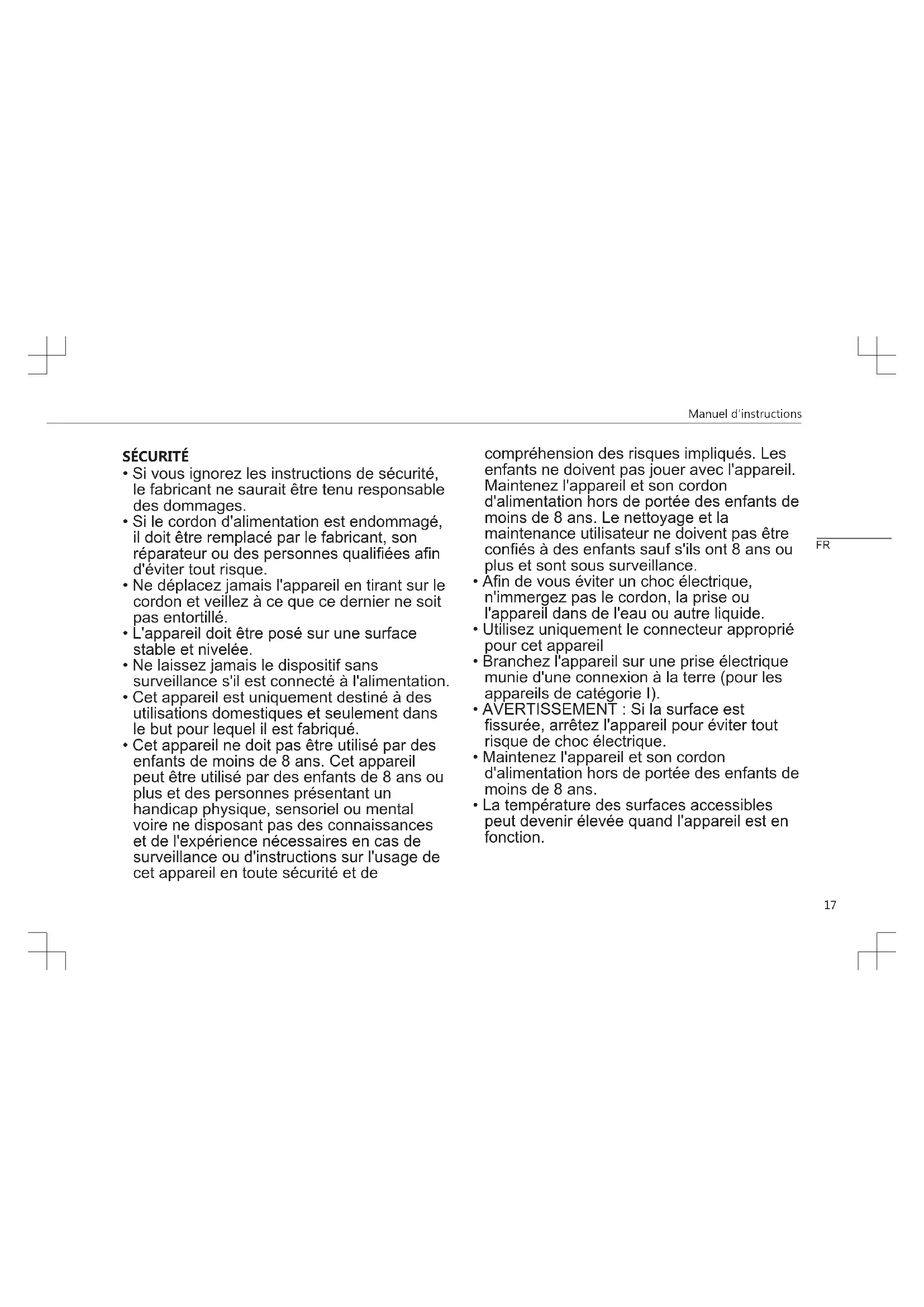 - Cet appareil ne doit pas être utilisé par des enfants de moins de 8 ans. Cet appareil peut être utilisé par des enfants de 8 ans ou plus et des personnes présentant un handicap physique, sensoriel ou mental voire ne disposant pas des connaissances et de l'expérience nécessaires en cas de surveillance ou d'instructions sur l'usage de cet appareil en toute sécurité et de compréhension des risques impliqués. Les enfants ne doivent pas jouer avec l'appareil. Maintenez l'appareil et son cordon d'alimentation hors de portée des enfants de moins de 8 ans. Le nettoyage et la maintenance utilisateur ne doivent pas être confiés à des enfants sauf s'ils ont 8 ans ou plus et sont sous surveillance.