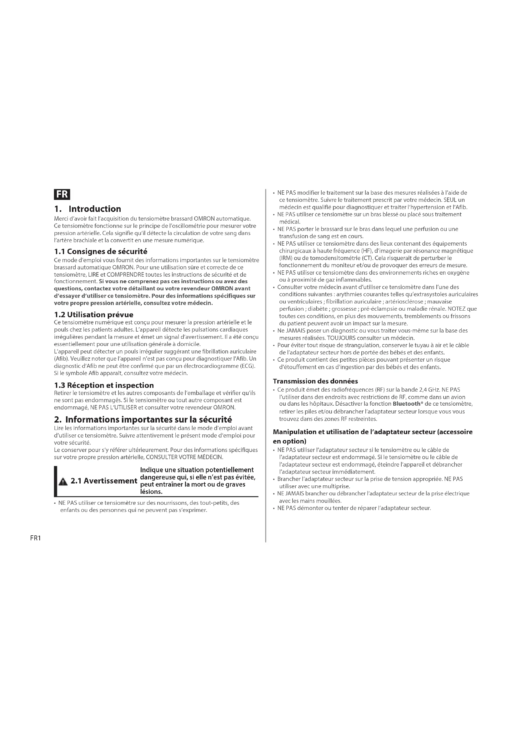 Lire les informations importantes sur la sécurité dans le mode d’emploi avant d’utiliser ce tensiomètre. Suivre attentivement le présent mode d’emploi pour votre sécurité. Le conserver pour s’y référer ultérieurement. Pour des informations spécifiques sur votre propre pression artérielle, CONSULTER VOTRE MÉDECIN.