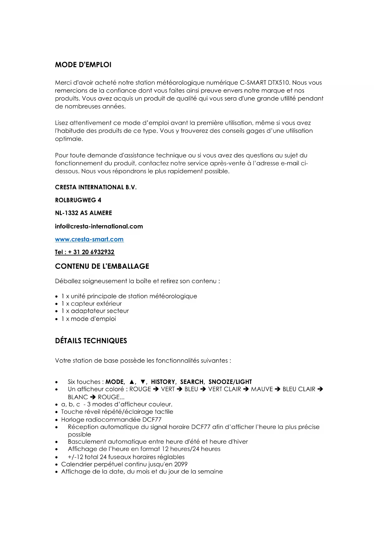 Merci d'avoir acheté notre station météorologique numérique C-SMART DTX510. Nous vous remercions de la confiance dont vous faites ainsi preuve envers notre marque et nos produits. Vous avez acquis un produit de qualité qui vous sera d'une grande'utilité pendant de nombreuses années.