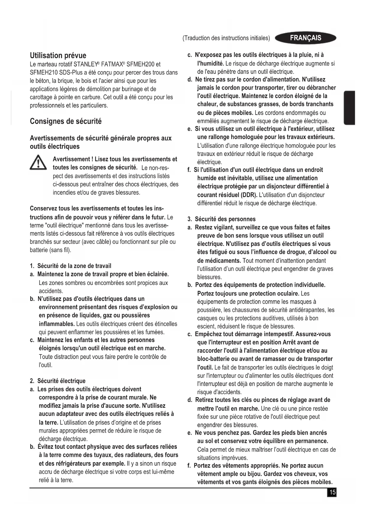 SFMEH200 et SFMEH210 SDS-Plus a été conçu pour percer des trous dans le béton, la brique, le bois et l'acier ainsi que pour les applications légères de démolition par burinage et de carottage à pointe en carbure. Cet outil a été conçu pour les professionnels et les particuliers. Consignes de sécurité Avertissements de sécurité générale propres aux outils électriques Avertissement ! Lisez tous les avertissements et toutes les consignes de sécurité. Le non-res- pect des avertissements et des instructions listés ci-dessous peut entraîner des chocs électriques, des incendies et/ou de graves blessures. Conservez tous les avertissements et toutes les ins- tructions an de pouvoir vous y référer dans le futur. Le terme "outil électrique" mentionné dans tous les avertisse- ments listés ci-dessous fait référence à vos outils électriques branchés sur secteur (avec câble) ou fonctionnant sur pile ou batterie (sans l).