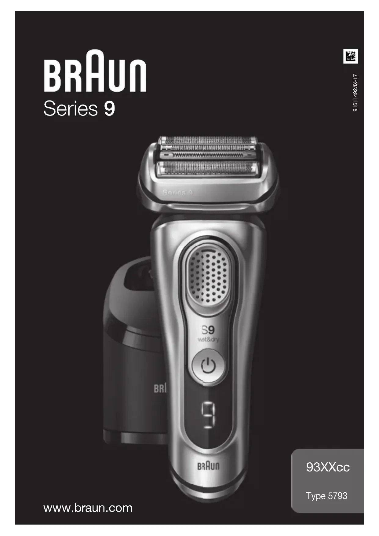 Increased consumption of cleaning fluid. Drain of the Clean & Charge station is clogged. – Clean the drain with a wooden toothpick. – Regularly wipe the tub clean. 91611492_93XXcc_W&D_MN_Type_5793_S6-76.indd 1491611492_93XXcc_W&D_MN_Type_5793_S6-76.indd 14 20.10.17 08:1620.10.17 08:16 CSS APPROVED Effective Date 23Oct2017 GMT - Printed 22Nov2017 Page 14 of 7615 Guarantee We grant a 2 year guarantee on the product commencing on the date of purchase. Within the guarantee period we will eliminate any defects in the appliance resulting from faults in materials or workmanship, free of charge either by repairing or replacing the complete appliance at our discretion. This guarantee extends to every country where this appliance is supplied by Braun or its appointed distributor. This guarantee does not cover: damage due to improper use, normal wear or use as well as defects that have a negligible effect on the value or operation of the appliance. The guarantee becomes void if repairs are undertaken by unauthorised persons and if original Braun parts are not used. To obtain service within the guarantee period, hand in or send the complete appliance with your sales receipt to an authorised Braun Customer Service Centre (address information available online at www.service.braun.com). For UK only: This guarantee in no way affects your rights under statutory law. 91611492_93XXcc_W&D_MN_Type_5793_S6-76.indd 1591611492_93XXcc_W&D_MN_Type_5793_S6-76.indd 15 20.10.17 08:1620.10.17 08:16 CSS APPROVED Effective Date 23Oct2017 GMT - Printed 22Nov2017 Page 15 of 7616 Français Nos produits sont conçus pour répondre aux normes les plus élevées en matière de qualité, fonctionnalité et design. Nous espérons que vous êtes satisfait de votre nouveau produit Braun. Lisez attentivement ces instructions car elles contiennent des informations sur la sécurité. Conservez-les pour une consultation ultérieure. Important Votre appareil est fourni avec un bloc d’alimentation, qui possède un trans- formateur sécurisé intégré à très basse tension. N’échangez ou ne modifiez aucune partie du câble, sous risque de recevoir un choc électrique. Utilisez uniquement le bloc d’alimentation fourni avec votre appareil. Si l’appareil porte la référence 492, il est possible de l’utiliser avec n’importe quel bloc d’alimentation Braun 492-XXXX. Cet appareil peut être nettoyé sous l’eau courante et utilisé dans le bain ou sous la douche. Pour des raisons de sécurité, l’appareil ne peut être utilisé que sans fil. Débran- chez le rasoir de l’alimentation avant de le nettoyer à l’eau. Ne pas utiliser si l’appareil, la grille ou le bloc d’alimentation sont endom- magés. Cet appareil peut être utilisé par des enfants de 8 ans et plus et par des per- sonnes dont les capacités physiques, sensorielles ou mentales sont réduites, ou des personnes dénuées d’expé- rience ou de connaissance, si elles ont pu bénéficier, par l’intermédiaire d’une personne responsable de leur sécurité, d’une surveillance ou d’instructions préalables concernant l’utilisation de l’appareil en toute sécurité et les dan- gers encourus. Les enfants ne doivent pas jouer avec l’appareil. Le nettoyage et l’entretien ne doivent pas être faits par des enfants, à moins qu’ils ne soient âgés de plus de 8 ans et qu’ils ne soient sous surveillance. Avertissements Maintenez le bloc d’alimentation, la base de recharge* et la station Clean & Charge* au sec. Station Clean & Charge* Pour éviter au liquide de nettoyage de couler, assurez-vous que la station Clean & Charge soit placée sur une surface plane. Lorsqu’une cartouche de nettoyage est installée, ne pas basculer, déplacer brusquement ou transporter la station de quelque manière, pour éviter que le liquide de nettoyage ne déborde de la cartouche. Ne pas placer la station dans une armoire à glace, ni la placer sur une surface polie ou laquée. La cartouche de nettoyage contient un liquide hautement inflammable il faut donc la garder à l’écart de toute source d’ignition. Ne pas la mettre pas au soleil, à proximité de cigarettes ou sur un radiateur. Ne pas recharger la cartouche et utiliser uniquement de véritables cartouches de rechange Braun.