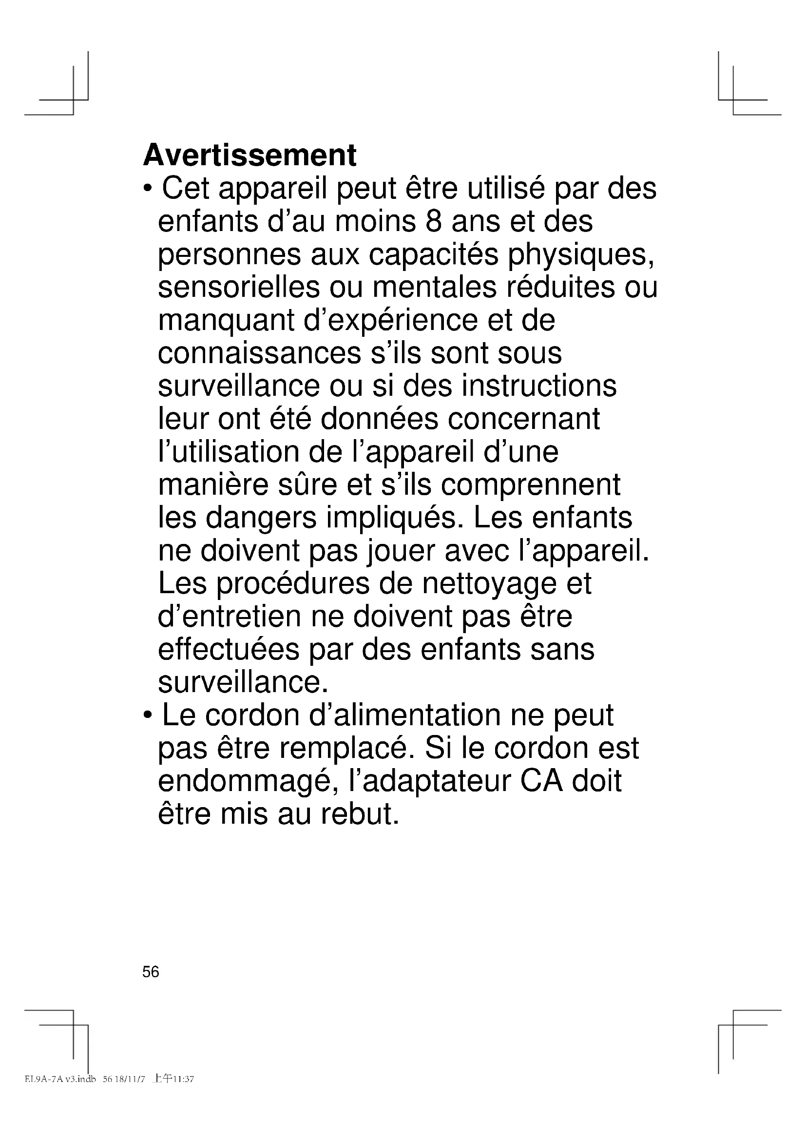 - Le cordon d’alimentation ne peut pas être remplacé. Si le cordon est endommagé, l’adaptateur CA doit être mis au rebut. EL9A-7A v3.indb 56 18/11/7 上午11:3757 GBDFINLEDKPNSFINPLCZSKHROTR