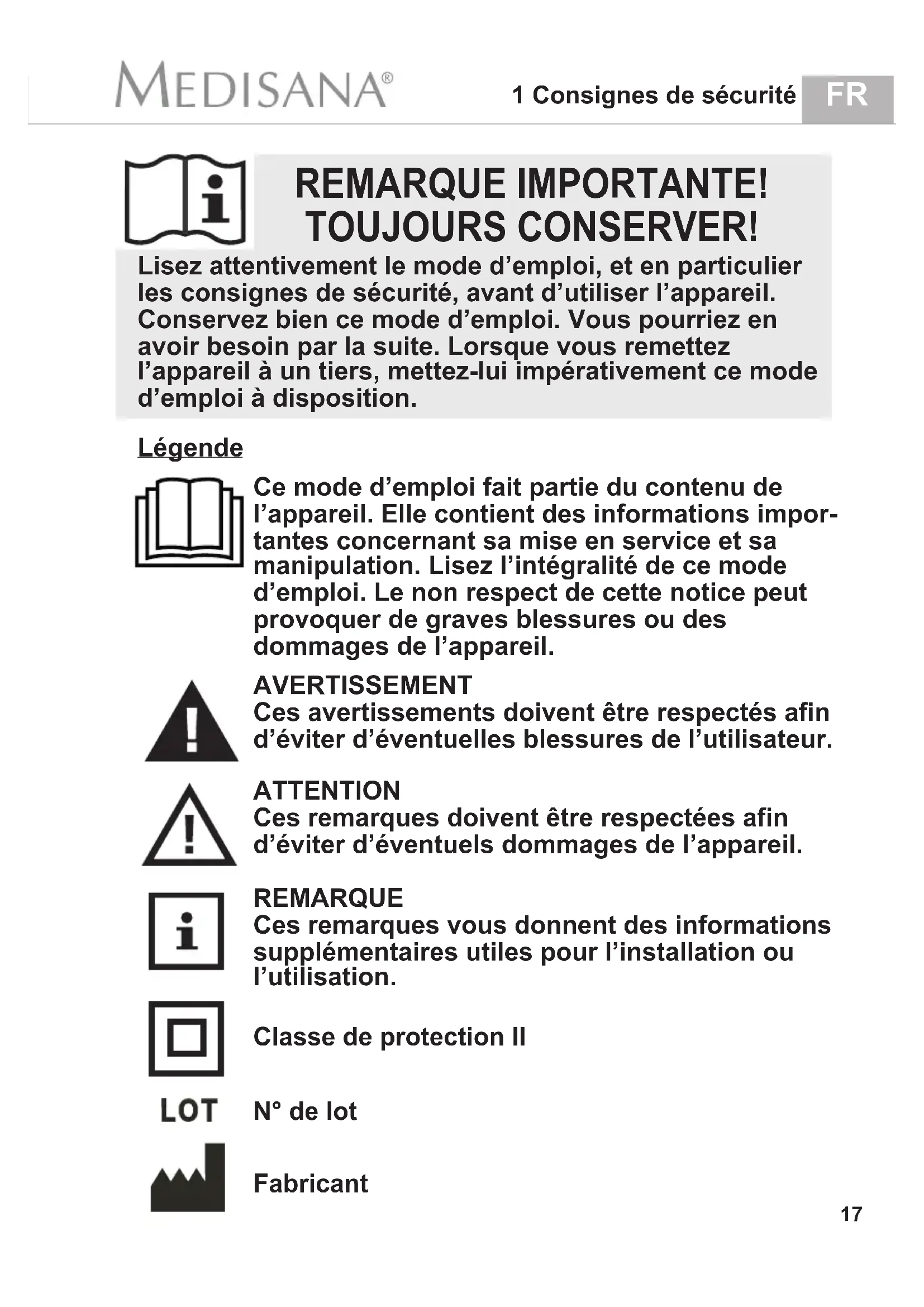 5 Warranty MEDISANA AG Jagenbergstraße 19 41468 NEUSS Germany eMail: info@medisana.de Internet: www.medisana.com The service centre address is shown on the attached leaflet.FR 1 Consignes de sécurité REMARQUE IMPORTANTE! TOUJOURS CONSERVER! Ce mode d’emploi fait partie du contenu de l’appareil. Elle contient des informations impor- tantes concernant sa mise en service et sa manipulation. Lisez l’intégralité de ce mode d’emploi. Le non respect de cette notice peut provoquer de graves blessures ou des dommages de l’appareil. AVERTISSEMENT Ces avertissements doivent être respectés afin d’éviter d’éventuelles blessures de l’utilisateur. ATTENTION Ces remarques doivent être respectées afin d’éviter d’éventuels dommages de l’appareil. REMARQUE Ces remarques vous donnent des informations supplémentaires utiles pour l’installation ou l’utilisation. Classe de protection II Légende N° de lot Fabricant Lisez attentivement le mode d’emploi, et en particulier les consignes de sécurité, avant d’utiliser l’appareil. Conservez bien ce mode d’emploi. Vous pourriez en avoir besoin par la suite. Lorsque vous remettez l’appareil à un tiers, mettez-lui impérativement ce mode d’emploi à disposition. 17• Avant de raccorder l’appareil à l’alimentation électrique, veillez à ce que la tension indiquée sur la plaque signalétique corresponde à celle de l’alimentation secteur. Maintenez le câble d’alimentation et l’appareil loin de toute source de chaleur, surface chaude, source d’humidité et de tout liquide. Ne touchez jamais à la fiche secteur ou à l’interrupteur d’alimentation avec des mains mouillées ou humides ou lorsque vous êtes dans l’eau. Ne rattrapez pas un appareil qui est tombé dans l’eau. Débranchez immédiatement la fiche secteur. L’appareil doit être branché de telle façon que la prise secteur soit facilement accessible. Éteignez toujours l'appareil immédiatement après l'utilisation à l'aide du bouton situé sur l'élément de commande et dé- branchez la fiche secteur de la prise murale. Pour débrancher l’appareil du courant, ne tirez jamais par le câble, mais débranchez la fiche au niveau de la prise! L’appareil ne doit jamais être soulevé, tiré ou tourné par le câble d’alimentation. Si le cordon d'alimentation est endommagé, il doit uniquement être remplacé par MEDISANA, un revendeur agréé ou une personne possédant les qualifications appropriées, afin d'éviter tout risque. Veillez à ce que personne ne puisse trébucher en raison des câbles. Ces derniers ne doivent pas être pliés, pincés ou tordus.