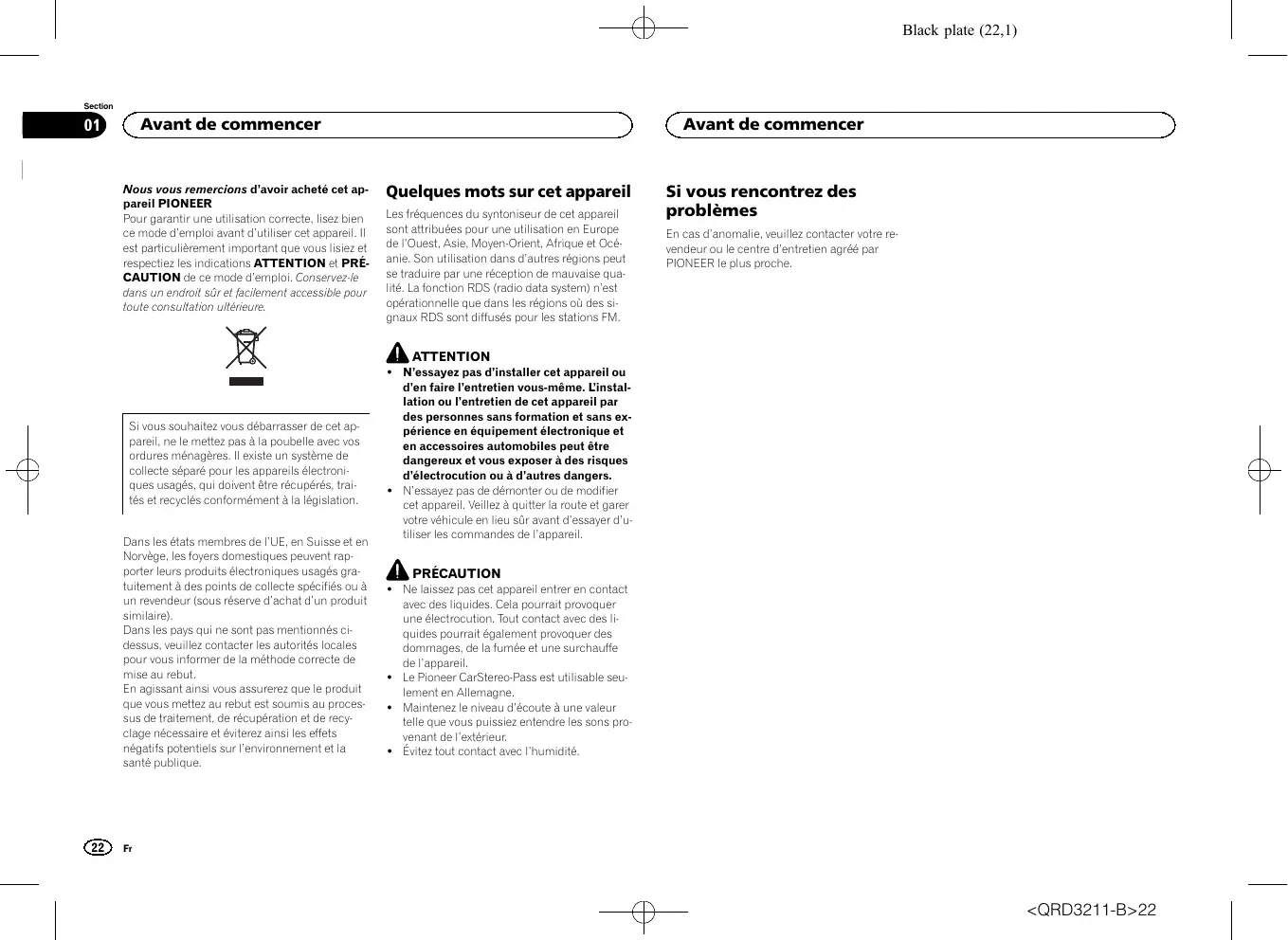 Nous vous remercions d’avoir acheté cet appareil PIONEER Pour garantir une utilisation correcte, lisez bien ce mode d’emploi avant d’utiliser cet appareil. Il est particulièrement important que vous lisiez et respectiez les indications ATTENTION et PRÉCAUTION de ce mode d’emploi. Conservez-le dans un endroit sûr et facilement accessible pour toute consultation ultérieure. Avant de commencer Quelques mots sur cet appareil Les fréquences du syntoniseur de cet appareil sont attribuées pour une utilisation en Europe de l’Ouest, Asie, Moyen-Orient, Afrique et Océanie. Son utilisation dans d’autres régions peut se traduire par une réception de mauvaise qualité. La fonction RDS (radio data system) n’est opérationnelle que dans les régions où des signaux RDS sont diffusés pour les stations FM. Si vous rencontrez des problèmes En cas d’anomalie, veuillez contacter votre revendeur ou le centre d’entretien agréé par PIONEER le plus proche. ATTENTION Si vous souhaitez vous débarrasser de cet appareil, ne le mettez pas à la poubelle avec vos ordures ménagères. Il existe un système de collecte séparé pour les appareils électroniques usagés, qui doivent être récupérés, traités et recyclés conformément à la législation. Dans les états membres de l’UE, en Suisse et en Norvège, les foyers domestiques peuvent rapporter leurs produits électroniques usagés gratuitement à des points de collecte spécifiés ou à un revendeur (sous réserve d’achat d’un produit similaire). Dans les pays qui ne sont pas mentionnés cidessus, veuillez contacter les autorités locales pour vous informer de la méthode correcte de mise au rebut. En agissant ainsi vous assurerez que le produit que vous mettez au rebut est soumis au processus de traitement, de récupération et de recyclage nécessaire et éviterez ainsi les effets négatifs potentiels sur l’environnement et la santé publique.