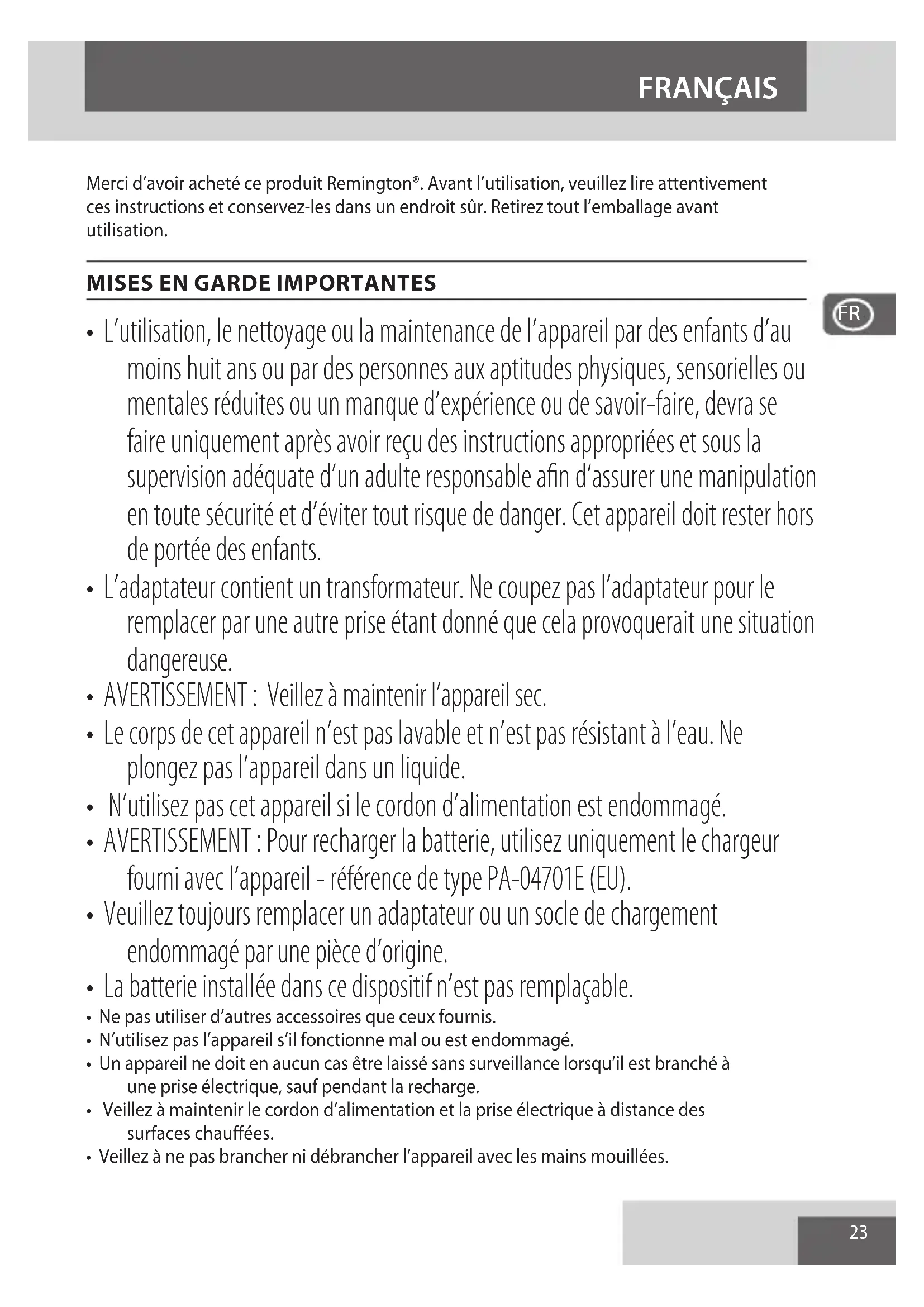 Merci d’avoir acheté ce produit Remington®. Avant l’utilisation, veuillez lire attentivement ces instructions et conservez-les dans un endroit sûr. Retirez tout l’emballage avant utilisation.