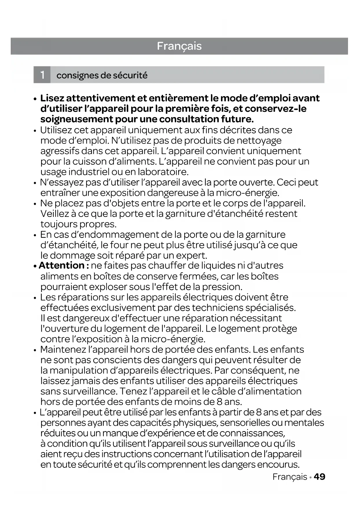 - Attention: ne faites pas chauffer de liquides ni d'autres alimentes en boîtes de conserve fermées, car les boîtes pourraient exploser sous l'effet de la pression.