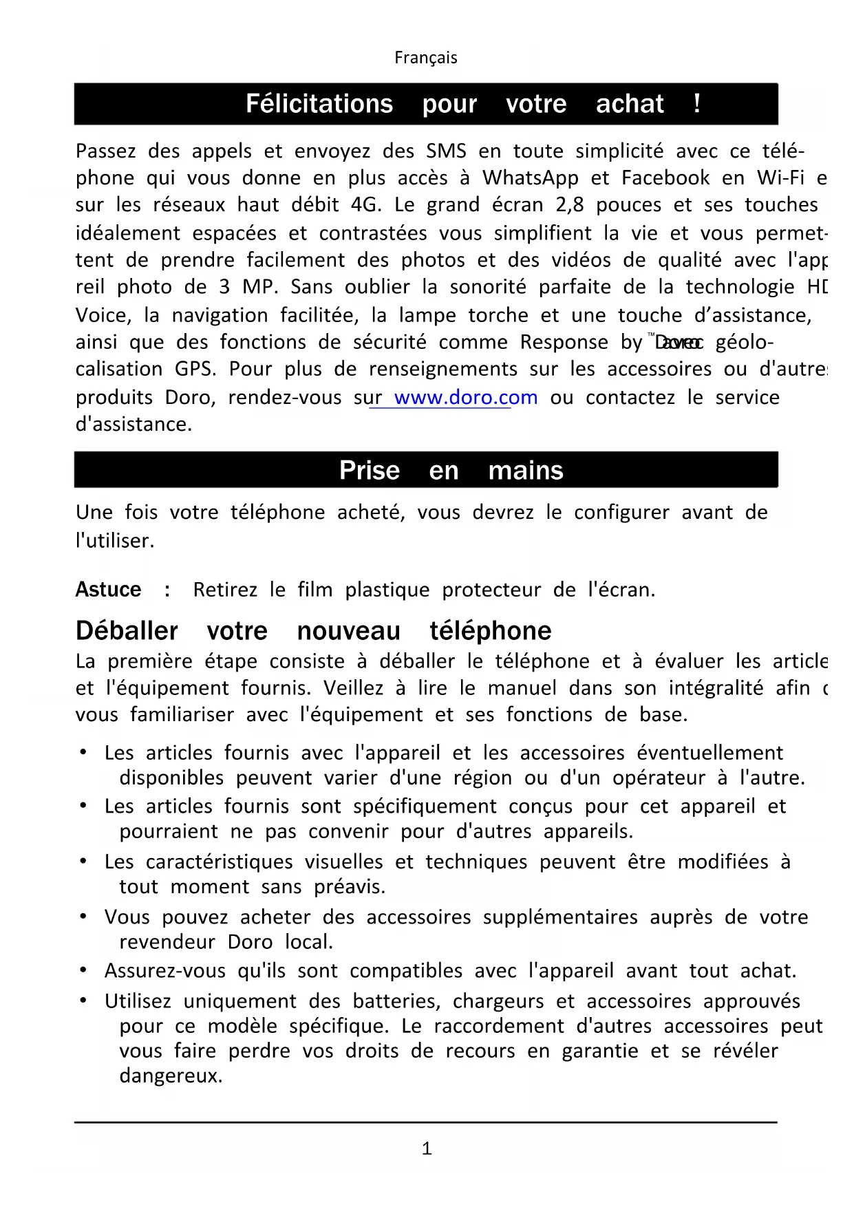 avec géolo- calisation GPS. Pour plus de renseignements sur les accessoires ou d'autres produits Doro, rendez-vous sur www.doro.com ou contactez le service d'assistance. Prise en mains Une fois votre téléphone acheté, vous devrez le configurer avant de l'utiliser. Astuce : Retirez le film plastique protecteur de l'écran. Déballer votre nouveau téléphone La première étape consiste à déballer le téléphone et à évaluer les articles et l'équipement fournis. Veillez à lire le manuel dans son intégralité afin de vous familiariser avec l'équipement et ses fonctions de base.