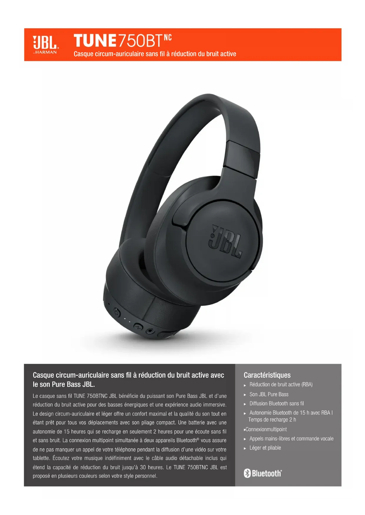 vous assure de ne pas manquer un appel de votre téléphone pendant la diffusion d’une vidéo sur votre tablette. Écoutez votre musique indéfiniment avec le câble audio détachable inclus qui étend la capacité de réduction du bruit jusqu’à 30 heures. Le TUNE 750BTNC JBL est proposé en plusieurs couleurs selon votre style personnel.HARMAN International Industries, Incorporated8500 Balboa Boulevard, Northridge, CA 91329 USAwww.jbl.com© 2019 HARMAN International Industries, Incorporated. Tous droits réservés. JBL est une marque de commerce de HARMAN International Industries, Incorporated, déposée aux États-Unis et/ou dans d’autres pays. La marque et les logos Bluetooth sont des marques déposées et sont détenues par Bluetooth SIG, Inc., et tout usage de ces marques par HARMAN International Industries, Incorporated se fait sous accord de licence. Les autres marques et noms commerciaux appartiennent à leurs propriétaires respectifs. Les caractéristiques, les spécifications et l’aspect sont susceptibles d’être modifiés sans préavis. Contenu de la boîte : 1 casque TUNE 750BTNC JBL Câble de recharge Câble audio détachable Carte de mise en garde Carte de garantie Fiche de sécurité Guide de démarrage rapide Spécifications techniques : Taille de haut-parleur : 40mm Réponse en fréquence: 20Hz– 20KHz Sensibilité en mode passif : 95 dBSPL/ 1mw Sensibilité en mode actif: 100dBSPL/ 1mw Impédance du transducteur: 32 ohm Puissance d’entrée max. (avec câble): 40mW Sensibilité de transmission : -15dBV/PA Puissance de l’émetteur Bluetooth: < 5dBm Modulation de l’émetteur Bluetooth: GFSK, π/4DQPSK, 8DPSK Fréquences Bluetooth: 2,402GHz– 2,48GHz Versions des profils Bluetooth : A2DP v1.2, AVRCP v1.5, HFP v1.6, HSP v1.2 Version Bluetooth: 4.2 Type de batterie du casque : Batterie Li-ion polymère (610 mAh, 3,7 V) Temps de charge : < 2 heures si vide Autonomie de lecture de musique avec BT et ANC actifs: 15heures Autonomie de lecture de musique avec BT actif et RBA inactive : 22heures Autonomie de lecture de musique avec BT inactif et RBA active: 30heures Poids: 220g Caractéristiques & Points Forts Réduction de bruit active (RBA) Concentrez-vous sur votre musique. Ignorez le bruit. Son JBL Pure Bass Depuis plus de 70 ans, JBL conçoit le son précis et impressionnant des grands espaces scéniques du monde entier. Ces écouteurs reproduisent ce même son JBL, en propulsant des basses profondes et puissantes. Diffusion Bluetooth sans fil Diffusez sans fil un son de haute qualité depuis vos appareils Bluetooth
