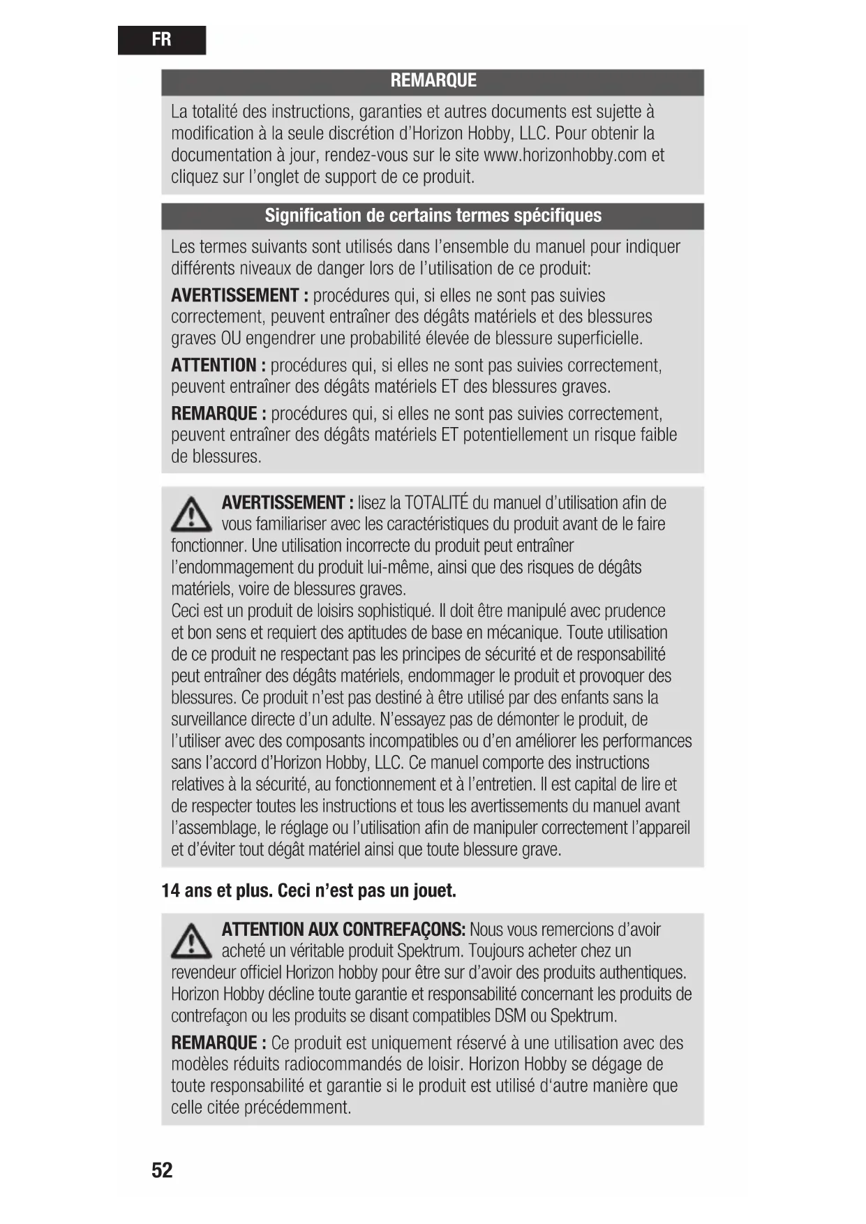 manipulation incorrecte du produit, une utilisation incorrecte ou commerciale de ce dernier ou encore des modifications de quelque nature qu’elles soient. La garantie ne couvre pas les dégâts résultant d’un montage ou d’une manipulation erronés, d’accidents ou encore du fonctionnement ainsi que des tentatives d’entretien ou de réparation non effectuées par Horizon. Les retours effectués par le fait de l’acheteur directement à Horizon ou à l’une de ses représentations nationales requièrent une confirmation écrite. Limitation des dégâts Horizon ne saurait être tenu pour responsable de dommages conséquents directs ou indirects, de pertes de revenus ou de pertes commerciales, liés de quelque manière que ce soit au produit et ce, indépendamment du fait qu’un recours puisse être formulé en relation avec un contrat, la garantie ou l’obligation de garantie. Par ailleurs, Horizon n’acceptera pas de recours issus d’un cas de garantie lorsque ces recours dépassent la valeur unitaire du produit. Horizon n’exerce aucune influence sur le montage, l’utilisation ou la maintenance du produit ou sur d’éventuelles combinaisons de produits choisies par l’acheteur. Horizon ne prend en compte aucune garantie et n‘accepte aucun recours pour les blessures ou les dommages pouvant en résulter. En utilisant et en montant le produit, l’acheteur accepte sans restriction ni réserve toutes les dispositions relatives à la garantie figurant dans le présent document. Si vous n’êtes pas prêt, en tant qu’acheteur, à accepter ces dispositions en relation avec l’utilisation du produit, nous vous demandons de restituer au vendeur le produit complet, non utilisé et dans son emballage d’origine. Indications relatives à la sécurité Ceci est un produit de loisirs perfectionné et non un jouet. Il doit être utilisé avec précaution et bon sens et nécessite quelques aptitudes mécaniques ainsi que mentales. L’incapacité à utiliser le produit de manière sûre et raisonnable peut provoquer des blessures et des dégâts matériels conséquents. Ce produit n’est pas destiné à être utilisé par des enfants sans la surveillance par un tuteur. La notice d’utilisation contient des indications relatives à la sécurité ainsi que des indications concernant la maintenance et le fonctionnement du produit. Il est absolument indispensable de lire et de comprendre ces indications avant la première mise en service. C’est uniquement ainsi qu’il sera possible d’éviter une manipulation erronée et des accidents entraînant des blessures et des dégâts. Questions, assistance et réparations Votre revendeur spécialisé local et le point de vente ne peuvent effectuer une estimation d’éligibilité à l’application de la garantie sans avoir consulté Horizon. Cela vaut également pour les réparations sous garantie. Vous voudrez bien, dans un tel cas, contacter le revendeur qui conviendra avec Horizon d’une décision appropriée, destinée à vous aider le plus rapidement possible. Maintenance et réparation Si votre produit doit faire l’objet d’une maintenance ou d‘une réparation, adressez- vous soit à votre revendeur spécialisé, soit directement à Horizon. Emballez le produit soigneusement. Veuillez noter que le carton d‘emballage d’origine ne suffit pas, en règle générale, à protéger le produit des dégâts pouvant survenir pendant le transport. Faites appel à un service de messagerie proposant une fonction de suivi et une assurance, puisque Horizon ne prend aucune responsabilité pour l’expédition du produit jusqu’à sa réception acceptée. Veuillez joindre une preuve d’achat, une description détaillée des défauts ainsi qu’une liste de tous les éléments distincts envoyés. Nous avons de plus besoin d’une adresse complète, d’un numéro de téléphone (pour demander des renseignements) et d’une adresse de courriel.FR