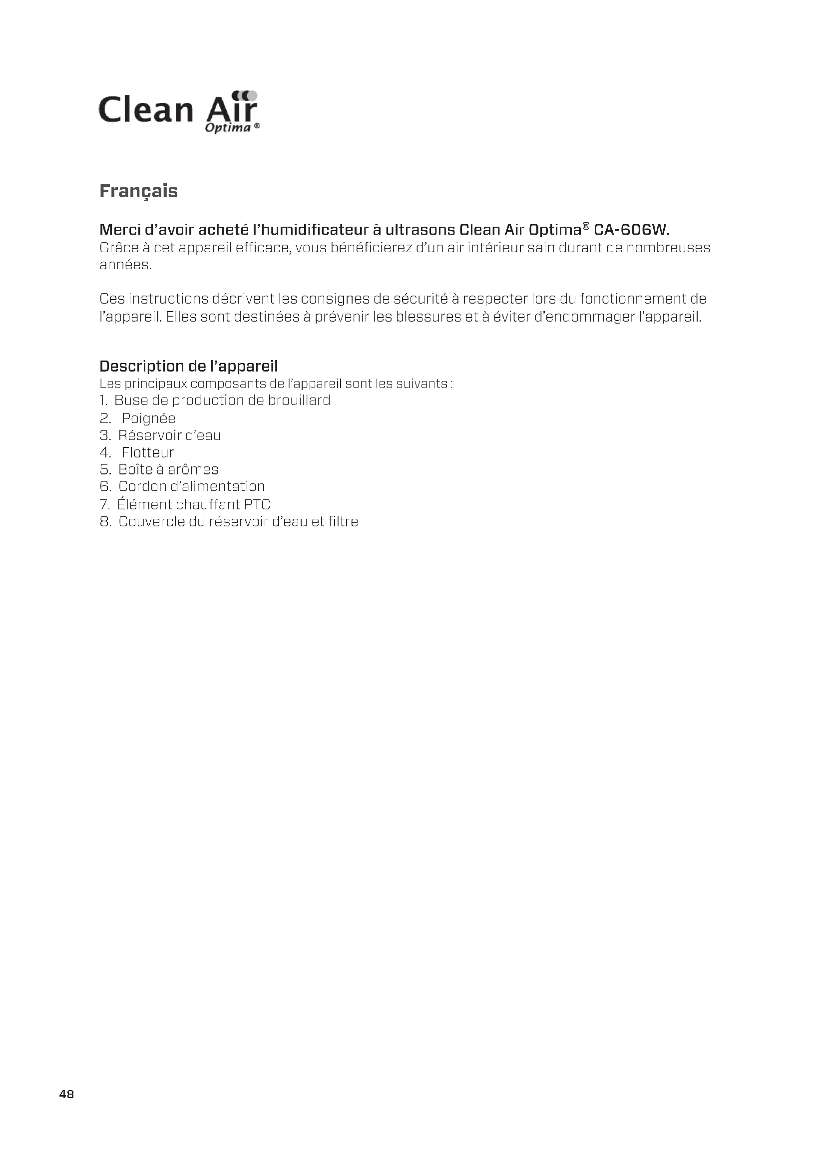 Merci d'avoir acheté l'humidificateur à ultrasons Clean Air Optima® CA-606W.