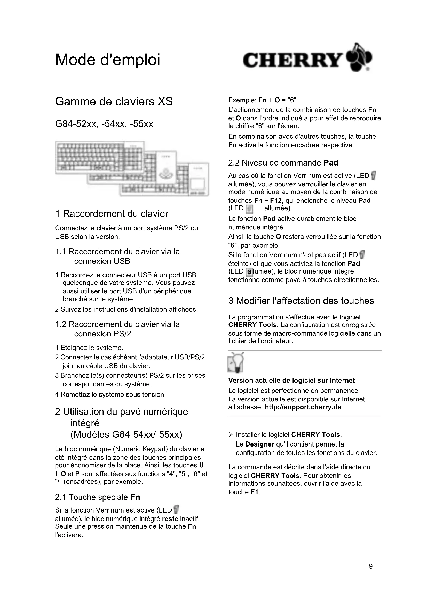 Au cas où la fonction Verr num est active (LED allumée), vous pouvez verrouiller le clavier en mode numérique au moyen de la combinaison de touches Fn + F12, qui enclenche le niveau Pad (LED allumée). La fonction Pad active durablement le bloc numérique intégré. Ainsi, la touche O restera verrouillée sur la fonction "6", par exemple. Si la fonction Verr num n'est pas actif (LED éteinte) et que vous activiez la fonction Pad (LED allumée), le bloc numérique intégré fonctionne comme pavé à touches directionnelles. 3 Modifier l'affectation des touches La programmation s'effectue avec le logiciel CHERRY Tools. La configuration est enregistrée sous forme de macro-commande logicielle dans un fichier de l'ordinateur. Version actuelle de logiciel sur Internet Le logiciel est perfectionné en permanence. La version actuelle est disponible sur Internet à l'adresse: http://support.cherry.de Installer le logiciel CHERRY Tools. Le Designer qu'il contient permet la configuration de toutes les fonctions du clavier. La commande est décrite dans l'aide directe du logiciel CHERRY Tools. Pour obtenir les informations souhaitées, ouvrir l'aide avec la touche F1. Mode d'emploi10 4 Fixation du clavier Cotes Un graphique avec les cotes du clavier et la position des dômes filetés se trouve dans les caractéristiques techniques à la fin du document.