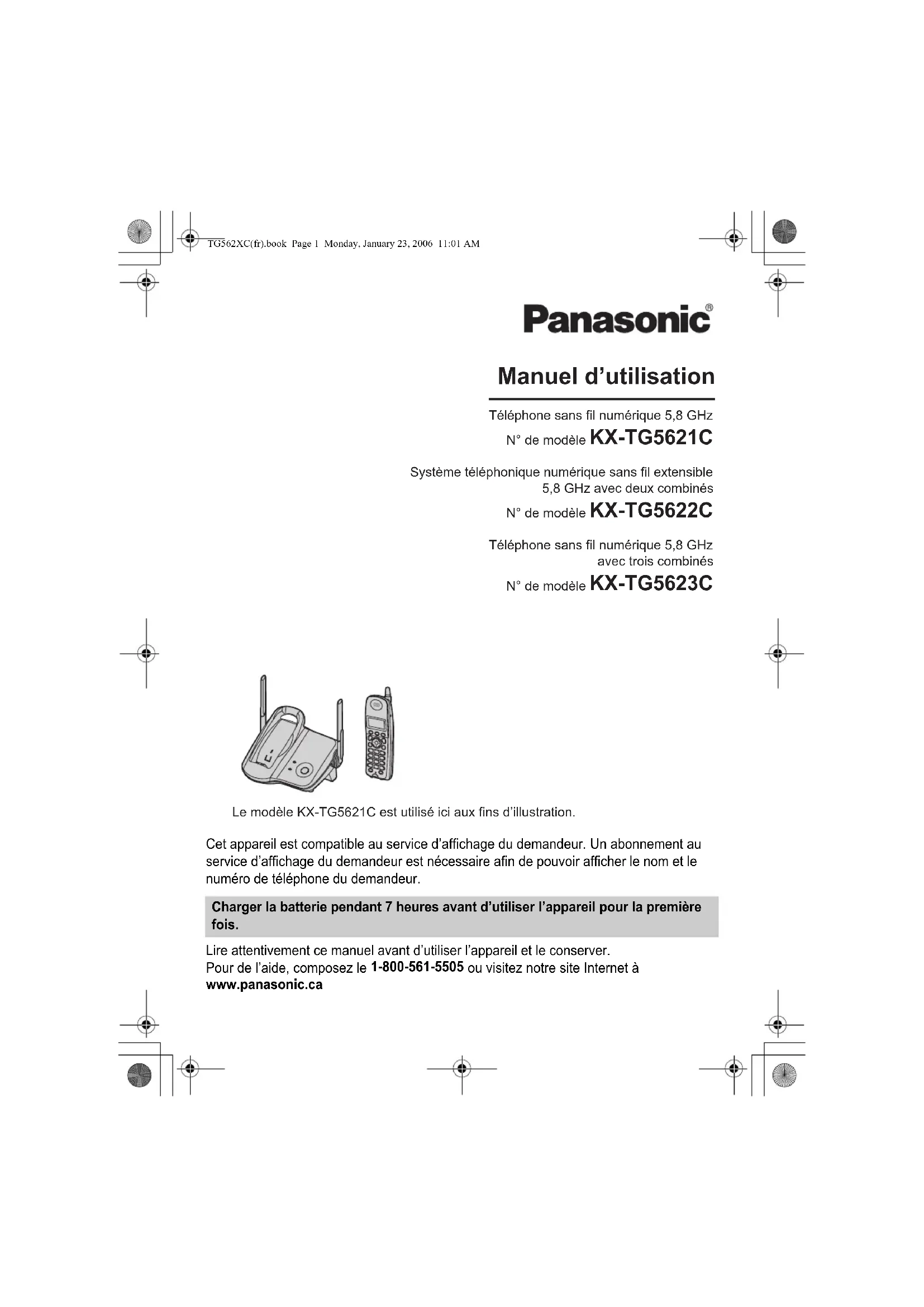 Cet appareil est compatible au service d’affichage du demandeur. Un abonnement au service d’affichage du demandeur est nécessaire afin de pouvoir afficher le nom et le numéro de téléphone du demandeur. Lire attentivement ce manuel avant d’utiliser l’appareil et le conserver. Pour de l’aide, composez le 1-800-561-5505 ou visitez notre site Internet à www.panasonic.ca Charger la batterie pendant 7 heures avant d’utiliser l’appareil pour la première fois. Manuel d’utilisation Téléphone sans fil numérique 5,8 GHz N° de modèle KX-TG5621C Système téléphonique numérique sans fil extensible 5,8 GHz avec deux combinés N° de modèle KX-TG5622C Téléphone sans fil numérique 5,8 GHz avec trois combinés N° de modèle KX-TG5623C Le modèle KX-TG5621C est utilisé ici aux fins d’illustration. TG562XC(fr).book Page 1 Monday, January 23, 2006 11:01 AMSommaire