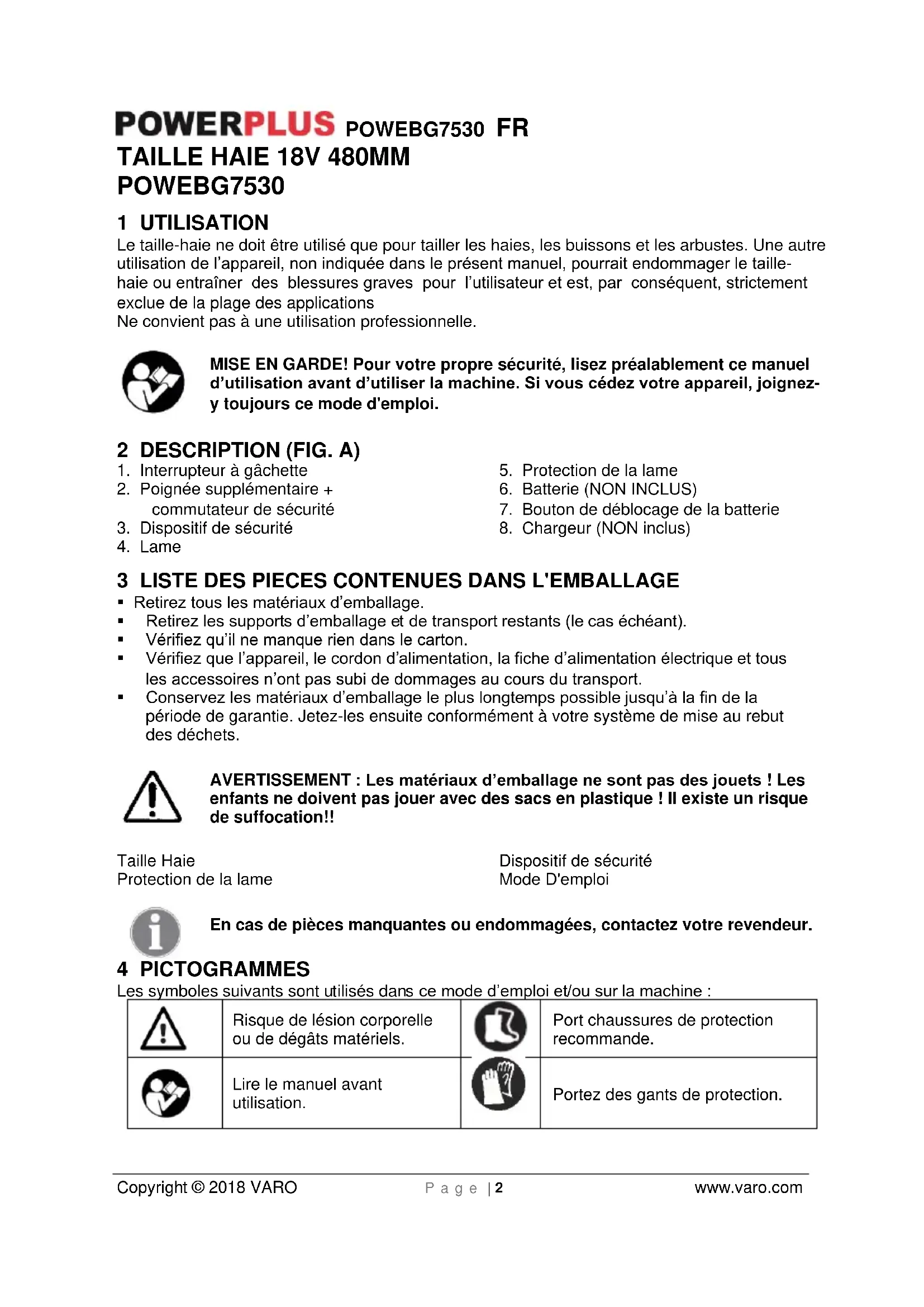 VARO N.V. - Joseph Van Instraat 9 - BE2500 Lier - BELGIQUE, déclare que : Appareil: Taille Haie Marque: POWERplus Modèle: POWEBG7530 est en conformité avec les exigences essentielles et les autres dispositions pertinentes des Directives européennes applicables, basées sur l'application des normes européennes harmonisées. Toute modification non autorisée de l'appareil annule cette déclaration. Directives européennes (y compris, le cas échéant, leurs amendements à la date de la signature) ; 2011/65/EU 2014/30/EG 2006/42/EG 2000/14/EG Annex V LwA 89dB(A) / 92dB(A) Normes européennes harmonisées (y compris, le cas échéant, leurs amendements à la date de la signature) ; EN60745-1: 2009 EN60745-2-15: 2009 EN55014-1: 2006 EN55014-2: 2015 Détenteur de la Documentation technique : Philippe Vankerkhove, VARO – Vic. Van Rompuy N.V. Le soussigné agit au nom du PDG de l'entreprise, Eric de Boer Réglementation – Directeur de la conformité Date: 24/10/2017POWEBG7530 EN Copyright © 2018 VARO P a g e | 1 www.varo.com 1 APPLICATION .................................................................................. 2