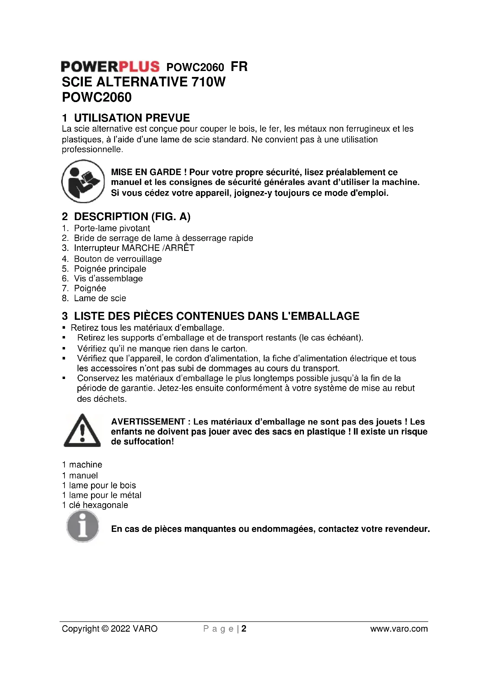 enfants ne doivent pas jouer avec des sacs en plastique ! Il existe un risque de suffocation! 1 machine 1 manuel 1 lame pour le bois 1 lame pour le métal 1 clé hexagonale En cas de pièces manquantes ou endommagées, contactez votre revendeur.POWC2060 FR Copyright © 2022 VARO P a g e | 3 www.varo.com 4 PICTOGRAMMES Les symboles suivants sont utilisés dans ce mode d’emploi et/ou sur la machine: