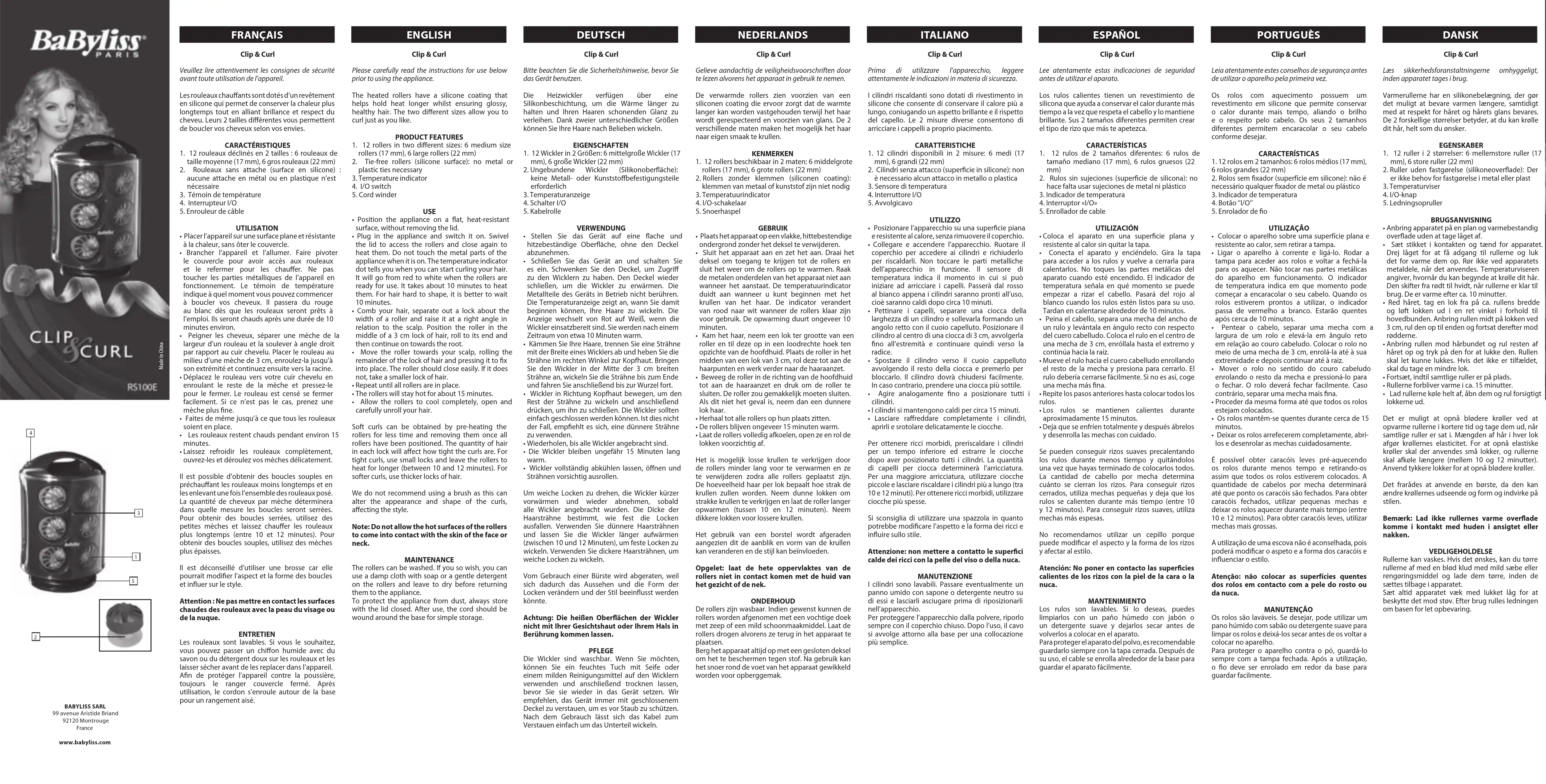 - Laissez refroidir les rouleaux complètement, ouvrez-les et déroulez vos mèches délicatement. Il est possible d’obtenir des boucles souples en préchauffant les rouleaux moins longtemps et en les enlevant une fois l’ensemble des rouleaux posé. La quantité de cheveux par mèche déterminera dans quelle mesure les boucles seront serrées. Pour obtenir des boucles serrées, utilisez des petites mèches et laissez chauffer les rouleaux plus longtemps (entre 10 et 12 minutes). Pour obtenir des boucles souples, utilisez des mèches plus épaisses. Il est déconseillé d’utiliser une brosse car elle pourrait modifier l’aspect et la forme des boucles et influer sur le style. Attention : Ne pas mettre en contact les surfaces chaudes des rouleaux avec la peau du visage ou de la nuque. ENTRETIEN Les rouleaux sont lavables. Si vous le souhaitez, vous pouvez passer un chiffon humide avec du savon ou du détergent doux sur les rouleaux et les laisser sécher avant de les replacer dans l’appareil. Afin de protéger l’appareil contre la poussière, toujours le ranger couvercle fermé. Après utilisation, le cordon s’enroule autour de la base pour un rangement aisé. Clip & Curl Please carefully read the instructions for use below prior to using the appliance. The heated rollers have a silicone coating that helps hold heat longer whilst ensuring glossy, healthy hair. The two different sizes allow you to curl just as you like. PRODUCT FEATURES