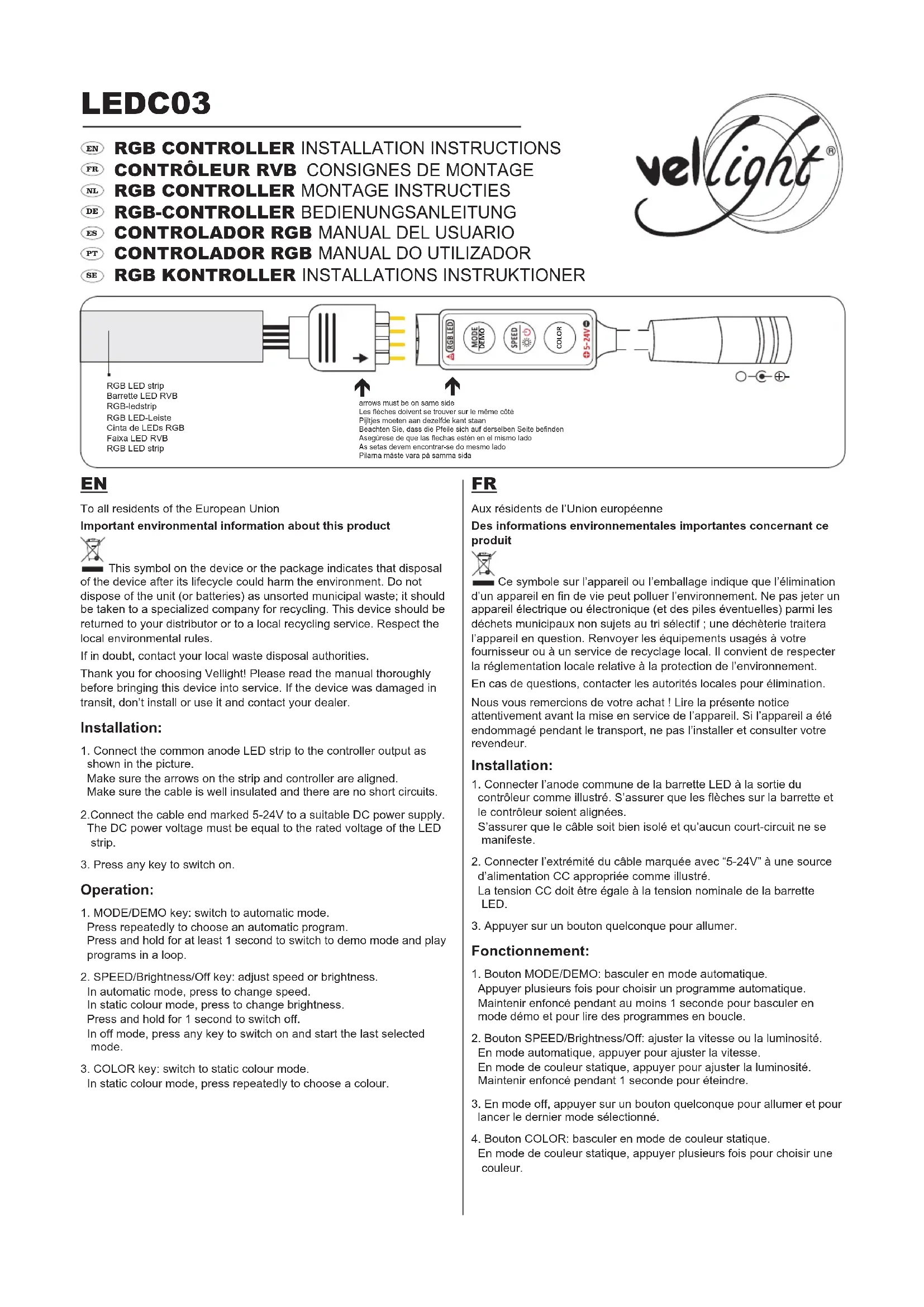 Aux résidents de l’Union européenneDes informations environnementales importantes concernant ce produit Ce symbole sur l’appareil ou l’emballage indique que l’élimination d’un appareil en n de vie peut polluer l’environnement. Ne pas jeter un appareil électrique ou électronique (et des piles éventuelles) parmi les déchets municipaux non sujets au tri sélectif ; une déchèterie traitera l’appareil en question. Renvoyer les équipements usagés à votre fournisseur ou à un service de recyclage local. Il convient de respecter la réglementation locale relative à la protection de l’environnement.En cas de questions, contacter les autorités locales pour élimination.Nous vous remercions de votre achat ! Lire la présente notice attentivement avant la mise en service de l’appareil. Si l’appareil a été endommagé pendant le transport, ne pas l’installer et consulter votre revendeur.Installation:1. Connecter l’anode commune de la barrette LED à la sortie du contrôleur comme illustré. S’assurer que les èches sur la barrette et le contrôleur soient alignées. S’assurer que le câble soit bien isolé et qu’aucun court-circuit ne se manifeste.2. Connecter l’extrémité du câble marquée avec “5-24V” à une source d’alimentation CC appropriée comme illustré. La tension CC doit être égale à la tension nominale de la barrette LED.3. Appuyer sur un bouton quelconque pour allumer.Fonctionnement:1. Bouton MODE/DEMO: basculer en mode automatique. Appuyer plusieurs fois pour choisir un programme automatique. Maintenir enfoncé pendant au moins 1 seconde pour basculer en mode démo et pour lire des programmes en boucle.2. Bouton SPEED/Brightness/Off: ajuster la vitesse ou la luminosité. En mode automatique, appuyer pour ajuster la vitesse. En mode de couleur statique, appuyer pour ajuster la luminosité. Maintenir enfoncé pendant 1 seconde pour éteindre. 3. En mode off, appuyer sur un bouton quelconque pour allumer et pour lancer le dernier mode sélectionné.4. Bouton COLOR: basculer en mode de couleur statique. En mode de couleur statique, appuyer plusieurs fois pour choisir une couleur.