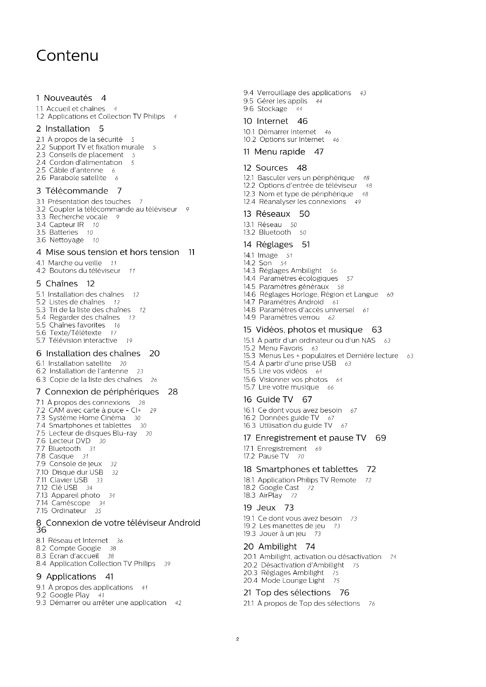 Paramètres Android 38 Paramètres écologiques 58 Paramètres d'accès universel 61 Pause TV 69 Photos, vidéos et musique 63 Pont hue 57 Problèmes, Chaînes 89 Problèmes, Connexion, Internet 90 Problèmes, Connexion, Wi-Fi 90 Problèmes, connexion HDMI 90 Problèmes, connexion USB 90 Problèmes, Image 89 Problèmes, langue menu incorrecte 90 Problèmes, Son 90 Problèmes, Télécommande 88 Programmes, Recommandations 76