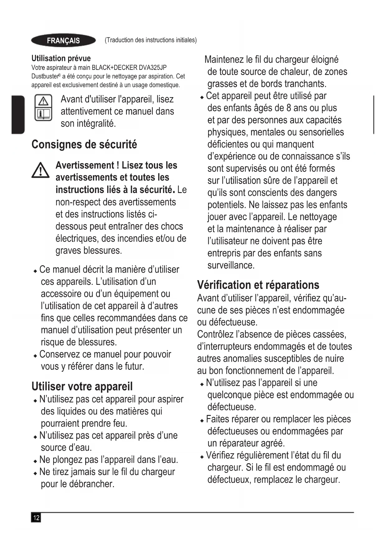 Avertissement ! Lisez tous les avertissements et toutes les instructions liés à la sécurité. Le non-respect des avertissements et des instructions listés ci- dessous peut entraîner des chocs électriques, des incendies et/ou de graves blessures. u Ce manuel décrit la manière d’utiliser ces appareils. L’utilisation d’un accessoire ou d’un équipement ou l’utilisation de cet appareil à d’autres ns que celles recommandées dans ce manuel d’utilisation peut présenter un risque de blessures. u Conservez ce manuel pour pouvoir vous y référer dans le futur. Utiliser votre appareil u N’utilisez pas cet appareil pour aspirer des liquides ou des matières qui pourraient prendre feu. u N’utilisez pas cet appareil près d’une source d’eau. u Ne plongez pas l’appareil dans l’eau.u Ne tirez jamais sur le l du chargeur pour le débrancher. Maintenez le l du chargeur éloigné de toute source de chaleur, de zones grasses et de bords tranchants. u Cet appareil peut être utilisé par des enfants âgés de 8 ans ou plus et par des personnes aux capacités physiques, mentales ou sensorielles décientes ou qui manquent d’expérience ou de connaissance s’ils sont supervisés ou ont été formés sur l’utilisation sûre de l’appareil et qu’ils sont conscients des dangers potentiels. Ne laissez pas les enfants jouer avec l’appareil. Le nettoyage et la maintenance à réaliser par l’utilisateur ne doivent pas être entrepris par des enfants sans surveillance. Vérication et réparations Avant d’utiliser l’appareil, vériez qu’au- cune de ses pièces n’est endommagée ou défectueuse. Contrôlez l’absence de pièces cassées, d’interrupteurs endommagés et de toutes autres anomalies susceptibles de nuire au bon fonctionnement de l’appareil. u N’utilisez pas l’appareil si une quelconque pièce est endommagée ou défectueuse. u Faites réparer ou remplacer les pièces défectueuses ou endommagées par un réparateur agréé. u Vériez régulièrement l’état du l du chargeur. Si le l est endommagé ou défectueux, remplacez le chargeur.13 (Traduction des instructions initiales) FRANÇAIS u Ne tentez jamais de retirer ou de remplacer des pièces autres que celles citées dans ce manuel. Consignes de sécurité supplé- mentaires Après utilisation u Débranchez le chargeur pour le nettoyer ou pour nettoyer la station de charge. u Lorsque vous n’utilisez pas l’appareil, rangez-le dans un endroit sec. u Les enfants ne doivent pas avoir accès aux appareils rangés. Risques résiduels Certains risques résiduels autres que ceux mentionnés dans les avertisse- ments sur la sécurité peuvent survenir en utilisant l’outil. Ces risques peuvent être provoqués par une utilisation incorrecte, prolongée, etc. Malgré l’application des normes de sécu- rité pertinentes et la mise en œuvre de dispositifs de sécurité, certains risques résiduels ne peuvent pas être évités. Ils comprennent : u Les blessures provoquées par le contact avec des pièces rotatives/ mobiles. u Les blessures provoquées pendant le remplacement de pièces, de lames ou d’accessoires. u Les blessures dues à l’utilisation prolongée d’un outil. Lorsque vous utilisez un outil quel qu’il soit pendant de longues périodes, assurez-vous de faire des pauses régulières. u La diminution de l’acuité auditive.u Les risques pour la santé provoqués par l’inhalation des poussières générées pendant l’utilisation de votre outil (exemple : travail avec du bois, surtout le chêne, le hêtre et les panneaux en MDF) Chargeurs Votre chargeur a été conçu pour une tension spécique. Vériez toujours que la tension du réseau électrique corre- spond à la tension gurant sur la plaque signalétique. Avertissement ! N’essayez jamais de remplacer le module de charge par une prise secteur ordinaire. u N’utilisez votre chargeur BLACK+DECKER que pour recharger la batterie fournie avec l’appareil. D’autres batteries pourraient exploser et provoquer des blessures et des dommages. u Ne tentez jamais de recharger des batteries non rechargeables. u Si le câble d’alimentation est endommagé, il doit être remplacé par le fabricant ou par un centre de réparation agréé BLACK+DECKER an d’éviter tout accident. u N’exposez pas le chargeur à l’eau.u N’ouvrez pas le chargeur.u Ne sondez pas le chargeur.u Pendant la charge, l’appareil/la batterie doivent être placés dans un endroit bien aéré.14 (Traduction des instructions initiales)FRANÇAIS Sécurité électrique Symboles sur le chargeur Lisez attentivement l’intégralité de ce manuel avant d’utiliser l’appar- eil.