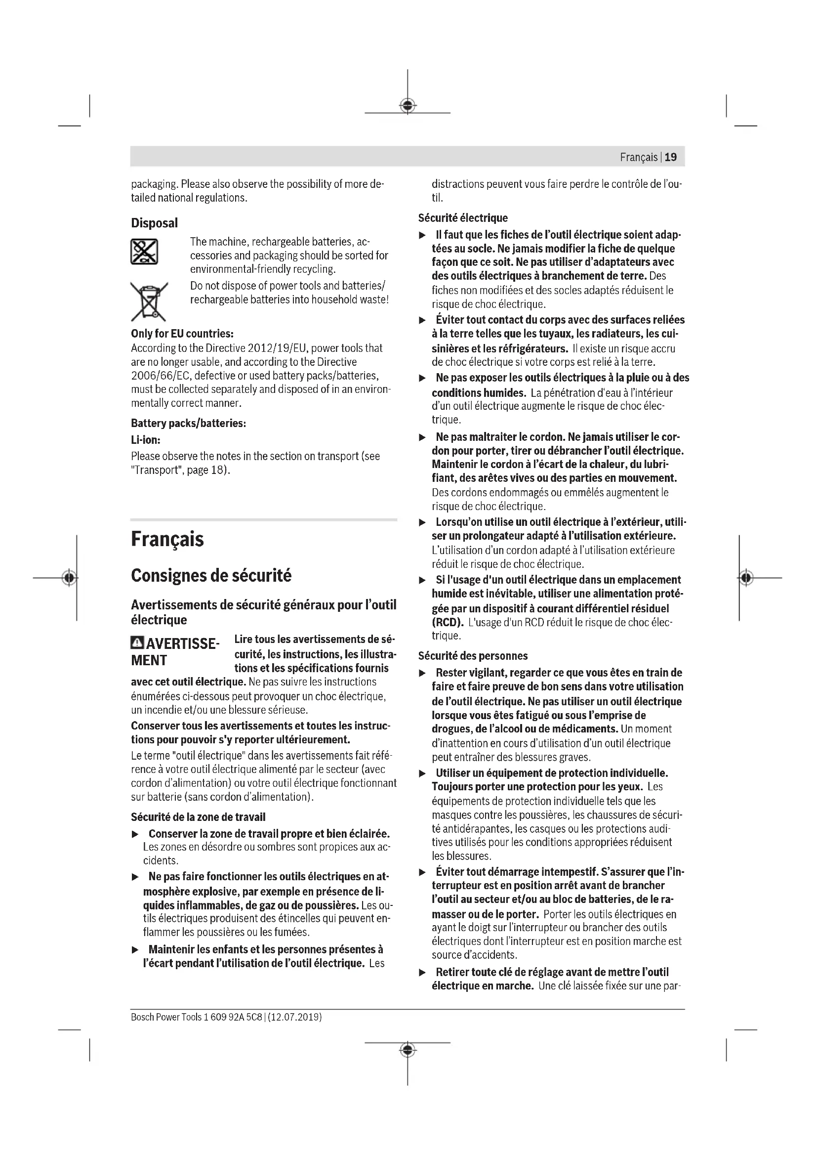 M6 2.71 3.61 4.52 4.8 5.42 6.02 7.22 8.13 9.7 13.6 16.2 M8 6.57 8.7 11 11.6 13.1 14.6 17.5 19.7 23 33 39 M10 13 17.5 22 23 26 29 35 39 47 65 78 M12 22.6 30 37.6 40 45 50 60 67 80 113 135 M14 36 48 60 65 72 79 95 107 130 180 215 M16 55 73 92 98 110 122 147 165 196 275 330 Tips Before screwing larger, longer screws into hard materials, it is advisable to pre-drill a pilot hole with the core diameter of the thread to approx. 2/3 of the screw length. Note: Ensure that no metal particles enter the power tool. After working at a low speed for an extended period, you should operate the power tool at the maximum speed for ap- proximately three minutes without load to cool it down. Belt clip You can use the belt clip (5) to hang the power tool on a belt, for example. You then have both hands free and the power tool is always at hand. Recommendations for optimal handling of the battery Protect the battery against moisture and water. Only store the battery within a temperature range of -20 to 50 °C. Do not leave the battery in your car in the summer, for example. A significantly reduced operating time after charging indic- ates that the battery has deteriorated and must be replaced. Follow the instructions on correct disposal. Maintenance and Service Maintenance and Cleaning u Clean the tool holder (1) and locking sleeve (2) from time to time and grease them lightly with 1 600 A00 2NE grease. u Remove the battery from the power tool before carry- ing out work on the power tool (e.g. maintenance, changing tool, etc.). The battery should also be re- moved for transport and storage. There is risk of injury from unintentionally pressing the on/off switch. u To ensure safe and efficient operation, always keep the power tool and the ventilation slots clean. After-Sales Service and Application Service Our after-sales service responds to your questions concern- ing maintenance and repair of your product as well as spare parts. You can find explosion drawings and information on spare parts at: www.bosch-pt.com The Bosch product use advice team will be happy to help you with any questions about our products and their accessor- ies. In all correspondence and spare parts orders, please always include the 10‑digit article number given on the nameplate of the product. Australia, New Zealand and Pacific Islands Robert Bosch Australia Pty. Ltd. Power Tools Locked Bag 66 Clayton South VIC 3169 Customer Contact Center Inside Australia: Phone: (01300) 307044 Fax: (01300) 307045 Inside New Zealand: Phone: (0800) 543353 Fax: (0800) 428570 Outside AU and NZ: Phone: +61 3 95415555 www.bosch-pt.com.au www.bosch-pt.co.nz Great Britain Robert Bosch Ltd. (B.S.C.) P.O. Box 98 Broadwater Park North Orbital Road Denham Uxbridge UB 9 5HJ At www.bosch-pt.co.uk you can order spare parts or arrange the collection of a product in need of servicing or repair. Tel. Service: (0344) 7360109 E-Mail: boschservicecentre@bosch.com Ireland Origo Ltd. Unit 23 Magna Drive Magna Business Park City West Dublin 24 Tel. Service: (01) 4666700 Fax: (01) 4666888 Republic of South Africa Customer service Hotline: (011) 6519600 Gauteng – BSC Service Centre 35 Roper Street, New Centre Johannesburg Tel.: (011) 4939375 1 609 92A 5PX | (16.03.2020) Bosch Power ToolsFrançais | 19 Fax: (011) 4930126 E-Mail: bsctools@icon.co.za KZN – BSC Service Centre Unit E, Almar Centre 143 Crompton Street Pinetown Tel.: (031) 7012120 Fax: (031) 7012446 E-Mail: bsc.dur@za.bosch.com Western Cape – BSC Service Centre Democracy Way, Prosperity Park Milnerton Tel.: (021) 5512577 Fax: (021) 5513223 E-Mail: bsc@zsd.co.za Bosch Headquarters Midrand, Gauteng Tel.: (011) 6519600 Fax: (011) 6519880 E-Mail: rbsa-hq.pts@za.bosch.com Armenia, Azerbaijan, Georgia Robert Bosch Ltd. David Agmashenebeli ave. 61 0102 Tbilisi, Georgia Tel. +995322510073 www.bosch.com Kyrgyzstan, Mongolia, Tajikistan, Turkmenistan, Uzbekistan TOO “Robert Bosch” Power Tools, After Sales Service Muratbaev Ave., 180 050012, Almaty, Kazakhstan Service Email: service.pt.ka@bosch.com Official Website: www.bosch.com, www.bosch-pt.com Transport The contained lithium-ion batteries are subject to the Dan- gerous Goods Legislation requirements. The batteries are suitable for road-transport by the user without further re- strictions. When shipping by third parties (e.g.: by air transport or for- warding agency), special requirements on packaging and la- belling must be observed. For preparation of the item being shipped, consulting an expert for hazardous material is re- quired. Dispatch battery packs only when the housing is undam- aged. Tape or mask off open contacts and pack up the bat- tery in such a manner that it cannot move around in the packaging. Please also observe the possibility of more de- tailed national regulations. Disposal Power tools, rechargeable batteries, accessor- ies and packaging should be sorted for environ- mental-friendly recycling. Do not dispose of power tools and batteries/re- chargeable batteries into household waste! Only for EU countries: According to the Directive 2012/19/EU, power tools that are no longer usable, and according to the Directive 2006/66/EC, defective or used battery packs/batteries, must be collected separately and disposed of in an environ- mentally correct manner. Battery packs/batteries: Li-ion: Please observe the notes in the section on transport (see "Transport", page19). Français Consignes de sécurité Avertissements de sécurité généraux pour l’outil électrique AVERTISSE- MENT Lire tous les avertissements de sé- curité, les instructions, les illustra- tions et les spécifications fournis avec cet outil électrique. Ne pas suivre les instructions énumérées ci-dessous peut provoquer un choc électrique, un incendie et/ou une blessure sérieuse. Conserver tous les avertissements et toutes les instruc- tions pour pouvoir s'y reporter ultérieurement. Le terme "outil électrique" dans les avertissements fait réfé- rence à votre outil élect