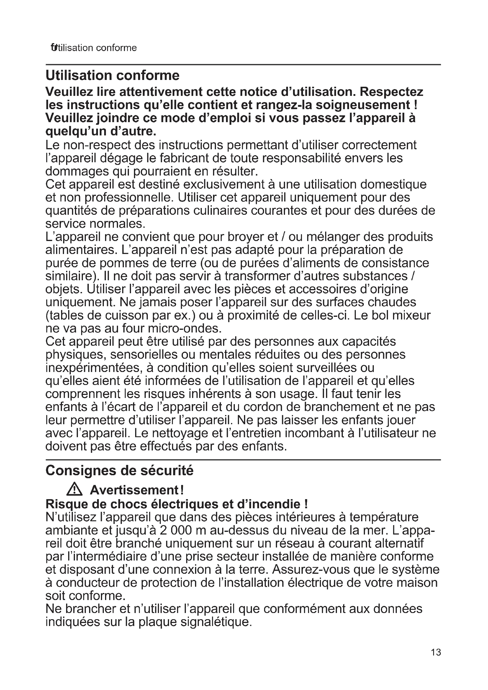 Utilisation conforme Utilisation conforme Veuillez lire attentivement cette notice d’utilisation. Respectez les instructions qu’elle contient et rangez-la soigneusement ! Veuillez joindre ce mode d’emploi si vous passez l’appareil à quelqu’un d’autre. Le non-respect des instructions permettant d’utiliser correctement l’appareil dégage le fabricant de toute responsabilité envers les dommages qui pourraient en résulter. Cet appareil est destiné exclusivement à une utilisation domestique et non professionnelle. Utiliser cet appareil uniquement pour des quantités de préparations culinaires courantes et pour des durées de service normales. L’appareil ne convient que pour broyer et / ou mélanger des produits alimentaires. L’appareil n’est pas adapté pour la préparation de purée de pommes de terre (ou de purées d’aliments de consistance similaire). Il ne doit pas servir à transformer d’autres substances / objets. Utiliser l’appareil avec les pièces et accessoires d’origine uniquement. Ne jamais poser l’appareil sur des surfaces chaudes (tables de cuisson par ex.) ou à proximité de celles-ci. Le bol mixeur ne va pas au four micro-ondes. Cet appareil peut être utilisé par des personnes aux capacités physiques, sensorielles ou mentales réduites ou des personnes inexpérimentées, à condition qu’elles soient surveillées ou qu’elles aient été informées de l’utilisation de l’appareil et qu’elles comprennent les risques inhérents à son usage. Il faut tenir les enfants à l’écart de l’appareil et du cordon de branchement et ne pas leur permettre d’utiliser l’appareil. Ne pas laisser les enfants jouer avec l’appareil. Le nettoyage et l’entretien incombant à l’utilisateur ne doivent pas être effectués par des enfants. Consignes de sécurité W Avertissement ! Risque de chocs électriques et d’incendie ! N’utilisez l’appareil que dans des pièces intérieures à température ambiante et jusqu’à 2 000 m au-dessus du niveau de la mer. L’appa- reil doit être branché uniquement sur un réseau à courant alternatif par l’intermédiaire d’une prise secteur installée de manière conforme et disposant d’une connexion à la terre. Assurez-vous que le système à conducteur de protection de l’installation électrique de votre maison soit conforme. Ne brancher et n’utiliser l’appareil que conformément aux données indiquées sur la plaque signalétique.14 fr Consignes de sécurité N’utiliser la machine que lorsque le cordon électrique et l’appareil ne présentent aucun dommage. Les réparations sur l’appareil telles que le remplacement d’un cordon endommagé ne doivent être effectuées que par notre SAV afin d’éliminer tout danger. Ne jamais brancher l’appareil à des minuteries ou des prises à télécommande ou le faire fonctionner à partir de celles-ci. Surveiller toujours l’appareil pendant son fonctionnement ! Ne jamais laisser l’appareil allumé plus longtemps que nécessaire au mixage des produits alimentaires à traiter. Ne pas mettre le cordon d’alimentation en contact avec des éléments brûlants et ne pas le faire glisser sur des arêtes vives. Ne jamais plonger l’appareil de base dans l’eau ou le mettre dans un lave- vaisselle. Ne pas utiliser l’appareil avec des mains humides, ne pas le faire tourner à vide. Lorsque vous plongez le mixeur dans les aliments à mixer, veillez à ce que le niveau de liquide ne monte pas au-dessus de la jonction entre le pied mixeur et l’appareil de base. L’appareil doit toujours être débranché du secteur, après chaque utilisation, lorsqu’il n’est pas sous surveillance, lorsqu’il doit être monté ou démonté, avant de le nettoyer et en cas de panne. W Avertissement ! Risque de blessure ! Prudence pendant le maniement de lames tranchantes, au moment de vider le bol ainsi que lors du nettoyage. Une fois l’appareil utilisé, attendre l’arrêt de la lame du mixeur plongeant. L’appareil doit être éteint et débranché du secteur avant de procéder au changement d’accessoires ou de pièces complémentaires mobiles en fonctionnement. Ne monter et démonter l’accessoire qu’une fois l’appareil immobile. Ne jamais toucher la lame du mixeur plongeant. Ne jamais nettoyer à mains nues la lame du pied mixeur. Utiliser une brosse. W Avertissement ! Risque de brûlures ! Attention lors du mixage d’aliments chauds. Les aliments chauds peuvent gicler pendant le mixage. Ne jamais poser le pied mixeur sur des surfaces très chaudes, ne jamais l’utiliser dans des aliments à mélanger très chauds. Laisser refroidir à 80°C ou moins les aliments bouillis avant de les mixer. Avant d’utiliser le mixeur plongeant dans une casserole, retirer préalablement cette dernière du foyer de cuisson. W Avertissement ! Risque d’étouffement ! Ne pas laisser les enfants jouer avec les emballages.15