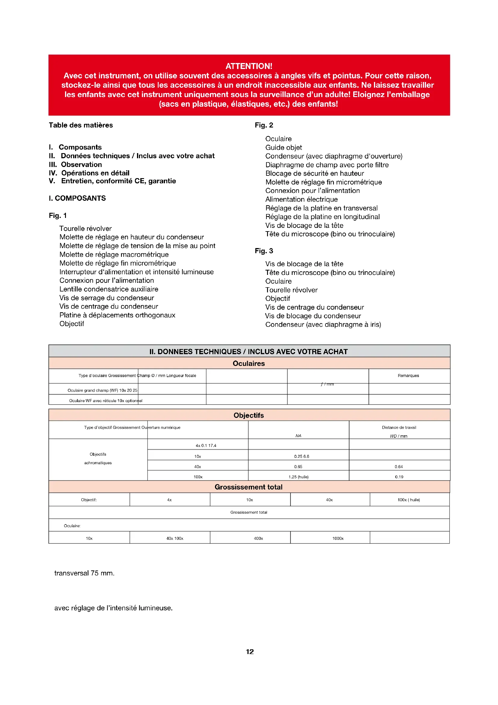 ATTENTION! Avec cet instrument, on utilise souvent des accessoires à angles vifs et pointus. Pour cette raison, stockez-le ainsi que tous les accessoires à un endroit inaccessible aux enfants. Ne laissez travailler les enfants avec cet instrument uniquement sous la surveillance d’un adulte! Eloignez l’emballage (sacs en plastique, élastiques, etc.) des enfants! Objectif: 4x 10x 40x 100x ( huile) Grossissement total Oculaire: 10x 40x 100x 400x 1000x Grossissement total1313