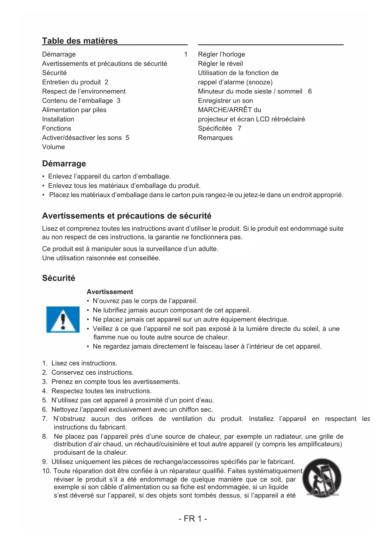 LISEZ COMPLÈTEMENT CE MANUEL D’UTILISATION AVANT D’UTILISER CET APPAREIL ET CONSERVEZ CE LIVRET POUR VOUS Y RÉFÉRER ULTÉRIEUREMENT. FR- FR 1 - Table des matières Démarrage 1 Avertissements et précautions de sécurité Sécurité Entretien du produit 2 Respect de l’environnement Contenu de l’emballage 3 Alimentation par piles Installation Fonctions Activer/désactiver les sons 5 Volume Régler l’horloge Régler le réveil Utilisation de la fonction de rappel d’alarme (snooze) Minuteur du mode sieste / sommeil 6 Enregistrer un son MARCHE/ARRÊT du projecteur et écran LCD rétroéclairé Spécicités 7 Remarques Démarrage