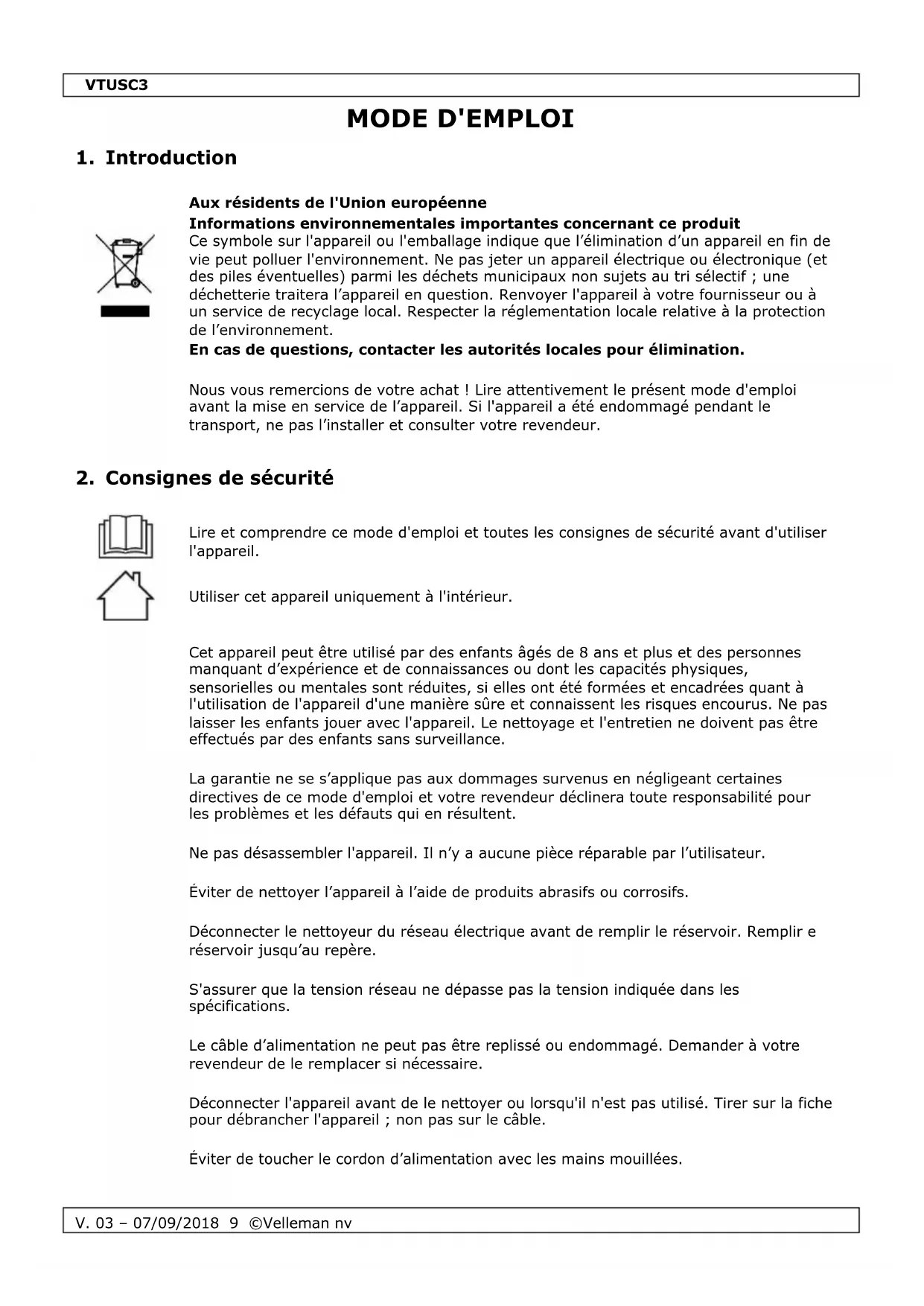 Velleman SA est l'ayant droit des droits d'auteur de ce mode d'emploi. Tous droits mondiaux réservés. Toutre reproduction, traduction, copie ou diffusion, intégrale ou partielle, du contenu de ce mode d'emploi parquelque procededou sur tout support electronique que ce soit interdite sans I'accord préalable ecrit de I'ayant droit.