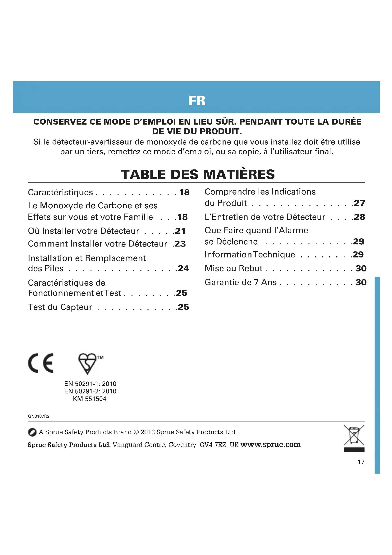NE PAS BRÛLER. GARANTIE Sprue Safety Products Ltd garantit à l’acheteur d’origine que le détecteur de monoxyde de carbone scellé joint ne présentera aucun défaut de matériaux et de fabrication dans des conditions d’utilisation résidentielle normales pendant 7 (sept) ans à compter de la date d’achat. Sprue Safety Products Ltd consent à remplacer gratuitement l’unité sur une période de 7 (sept) ans à compter de la date d’achat, à condition que le produit soit retourné au revendeur accompagné de la preuve d’achat. La garantie de remplacement du détecteur CO-AE-9B-BNL durera jusqu’à la fin de la période de la garantie initiale de l’alarme achetée dans un premier temps - c’est-à-dire à compter de la date d’achat initial et non pas à compter de la date de réception du produit de remplacement. Sprue Safety Products Ltd se réserve le droit de proposer un autre produit similaire à celui qui est remplacé si le modèle d’origine n’est plus disponible31 ou est en rupture de stock. Cette garantie ne peut être transférée. Une preuve d’achat est requise. Exclusion de garantie Cette garantie ne couvre pas les dégâts découlant d’un accident, d’une mauvaise utilisation, d’un démontage, d’un usage inadéquat ou d’un manque d’entretien raisonnable du produit, ou d’applications non conformes au manuel. Elle ne couvre pas les événements et situations hors du contrôle de Sprue Safety Products Ltd, tels que les catastrophes naturelles (incendie, intempéries etc.). Elle ne s’applique pas aux détaillants, centres de service ou distributeurs ou agents. Sprue Safety Products Ltd n’admettra aucune modification de cette garantie par des tiers. Sprue Safety Products Ltd ne sera pas tenue responsable des dommages secondaires provoqués par le manquement à une garantie explicite ou implicite. Sauf dans la mesure interdite par la loi en vigueur, toute garantie implicite de qualité marchande ou aptitude à une utilisation particulière est limitée dans la durée à 7 (sept) ans. Cette garantie n’a aucune incidence sur vos droits statutaires. Hors décès ou dommages corporels, Sprue Safety Products Ltd ne sera pas tenu responsable des pertes d’utilisation, dommages, coûts ou frais se rapportant à ce produit ou pertes ou coûts indirects ou secondaires encourus par vous ou tout autre utilisateur du produit.