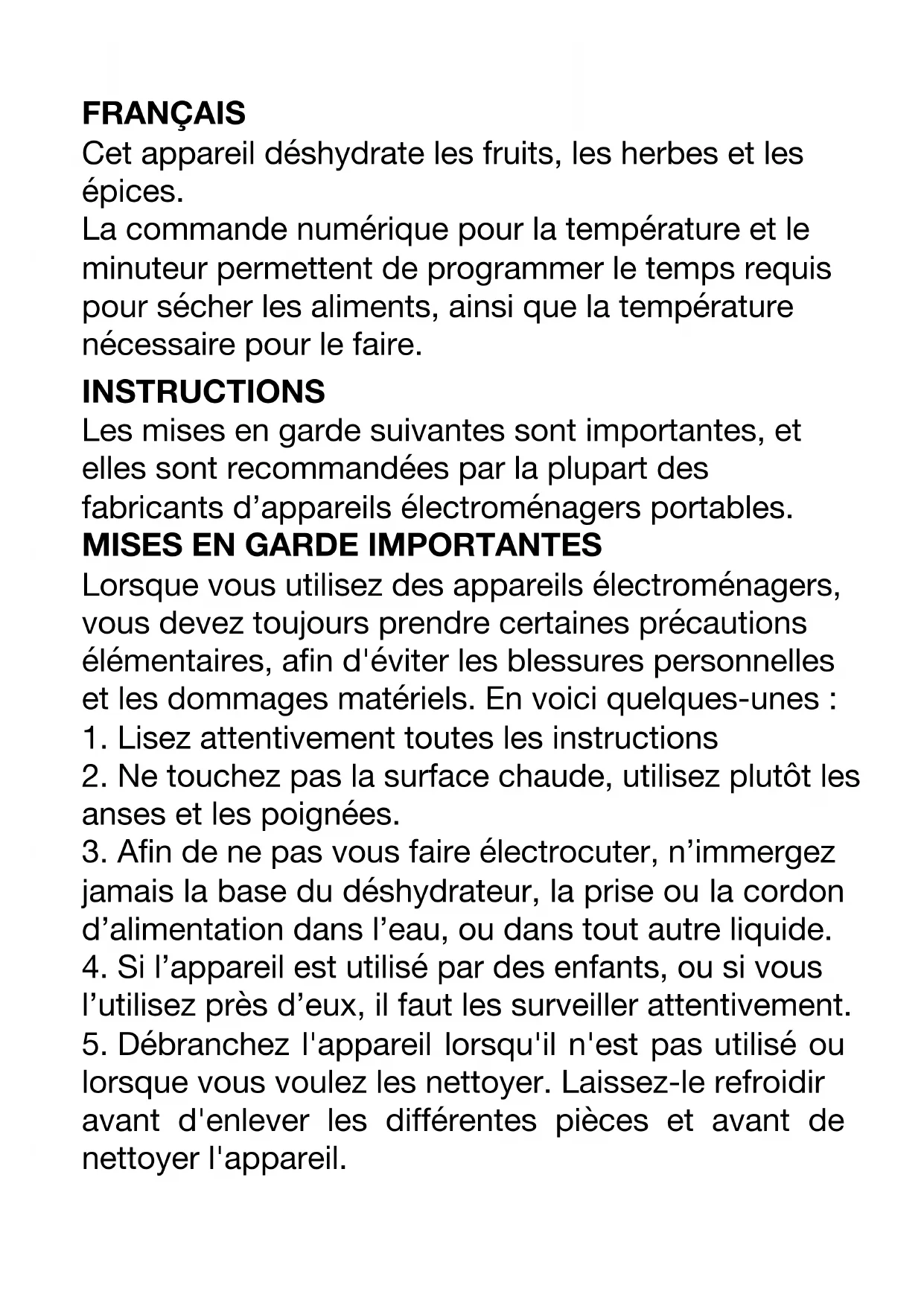 électrique, ou sur un four chauffé.12. N’utilisez jamais cet appareil pour déshydrater des aliments qui contiennent de l’alcool ou qui ont été marinées dans de l’alcool.