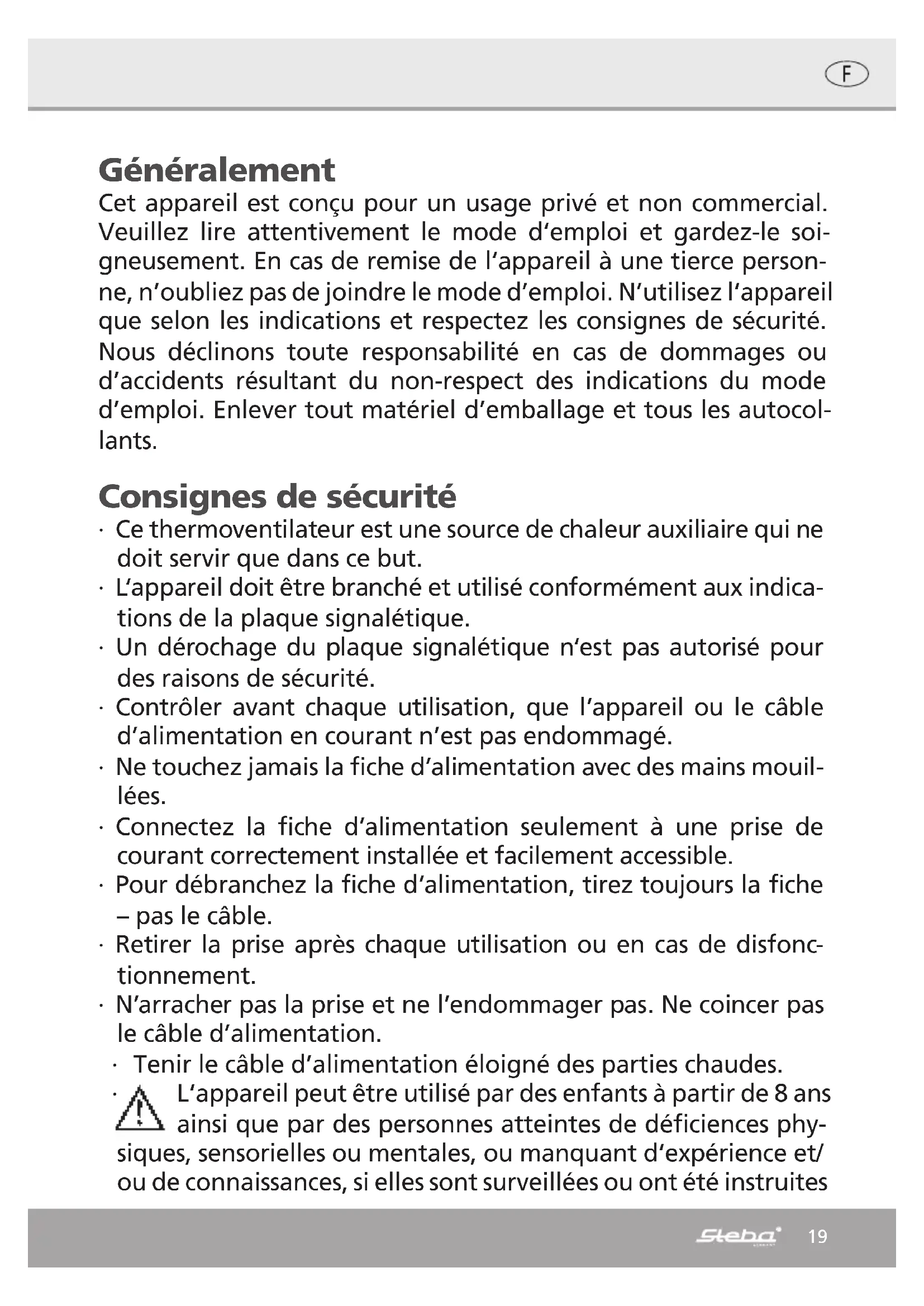 Correct Disposal of this product This marking indicates that this product should not be disposed with other household wastes throughout the EU. To prevent possible harm to the environment or human health from uncontrolled waste disposal, recycle it responsibly to promote the sustainable reuse of material resources. To return your used device, please use the return and collection systems or contact the retailer where the product was purchased. They can take this product for environmental safe recycling. Packaging disposal: Do not throw away the package materials. Please put it in the recycling bin. Gift box: Paper, should be put to the old paper collection point. Plastic packaging material and foils should be collected in the special collection containers. Service and Repair: If the appliance must be repaired, please get in touch with your trader or with the manufacturer: STEBA Elektrogeräte GmbH & Co KG Pointstr. 2, 96129 Strullendorf / Germany Distribution-Tel.: 09543 / 449-17 / -18, Service-Tel.: 09543 / 449-44, Fax: 09543 / 449-19 e-Mail: elektro@steba.com Internet: http://www.steba.com19 Généralement Cet appareil est conçu pour un usage privé et non commercial. Veuillez lire attentivement le mode d‘emploi et gardez-le soi- gneusement. En cas de remise de l‘appareil à une tierce person- ne, n’oubliez pas de joindre le mode d’emploi. N’utilisez l‘appareil que selon les indications et respectez les consignes de sécurité. Nous déclinons toute responsabilité en cas de dommages ou d’accidents résultant du non-respect des indications du mode d’emploi. Enlever tout matériel d’emballage et tous les autocol- lants. Consignes de sécurité ∙ Ce thermoventilateur est une source de chaleur auxiliaire qui ne doit servir que dans ce but. ∙ L‘appareil doit être branché et utilisé conformément aux indica- tions de la plaque signalétique. ∙ Un dérochage du plaque signalétique n‘est pas autorisé pour des raisons de sécurité. ∙ Contrôler avant chaque utilisation, que l’appareil ou le câble d’alimentation en courant n’est pas endommagé. ∙ Ne touchez jamais la fiche d’alimentation avec des mains mouil- lées. ∙ Connectez la fiche d’alimentation seulement à une prise de courant correctement installée et facilement accessible. ∙ Pour débranchez la fiche d’alimentation, tirez toujours la fiche – pas le câble. ∙ Retirer la prise après chaque utilisation ou en cas de disfonc- tionnement. ∙ N’arracher pas la prise et ne l’endommager pas. Ne coincer pas le câble d’alimentation. ∙ Tenir le câble d’alimentation éloigné des parties chaudes.