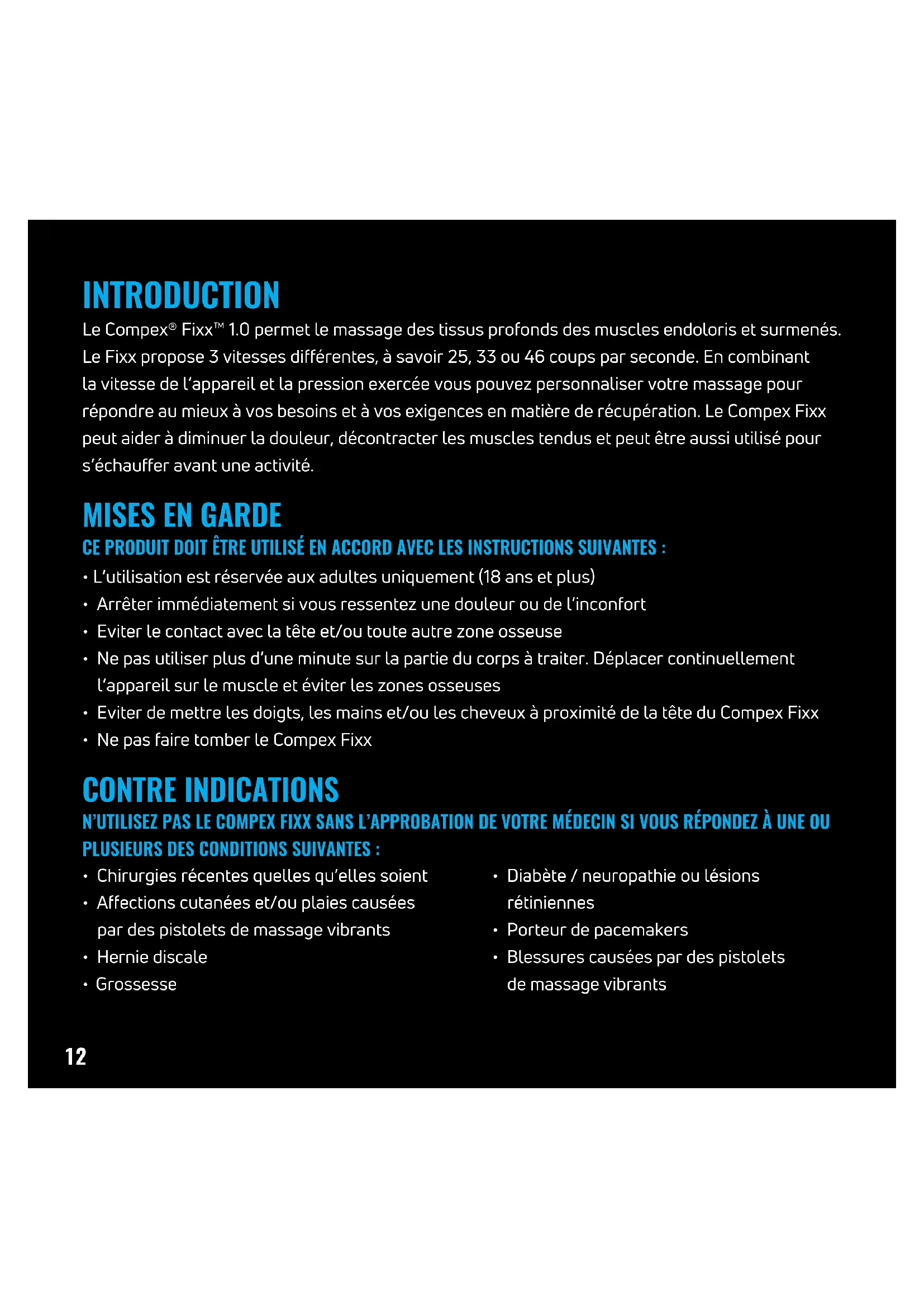 FR12 Le Compex® Fixx™ 1.0 permet le massage des tissus profonds des muscles endoloris et surmenés. Le Fixx propose 3 vitesses différentes, à savoir 25, 33 ou 46 coups par seconde. En combinant la vitesse de l’appareil et la pression exercée vous pouvez personnaliser votre massage pour répondre au mieux à vos besoins et à vos exigences en matière de récupération. Le Compex Fixx peut aider à diminuer la douleur, décontracter les muscles tendus et peut être aussi utilisé pour s’échauffer avant une activité. CE PRODUIT DOIT ÊTRE UTILISÉ EN ACCORD AVEC LES INSTRUCTIONS SUIVANTES :