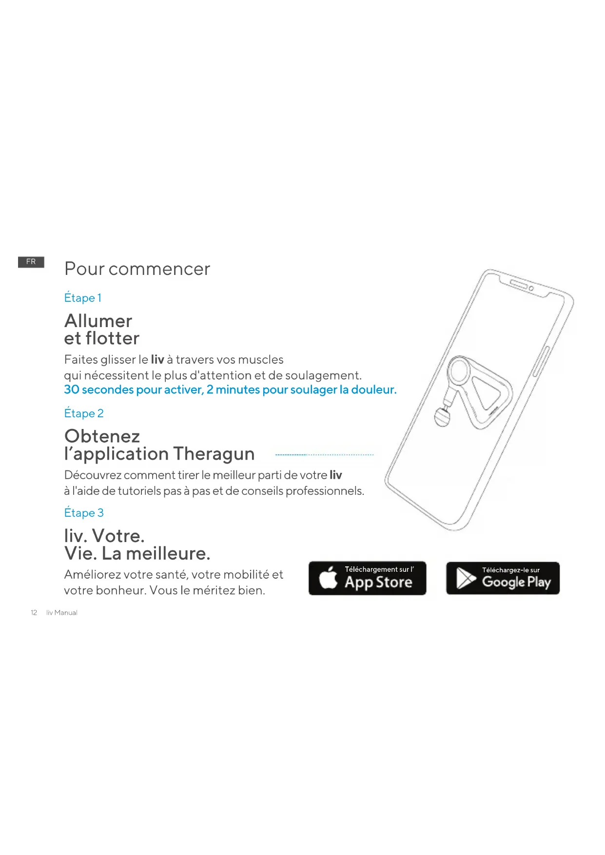 Téléchargez-le sur Étape 2 Obtenez l’application Theragun Découvrez comment tirer le meilleur parti de votre liv à l'aide de tutoriels pas à pas et de conseils professionnels. Étape 3 liv. Votre. Vie. La meilleure. Améliorez votre santé, votre mobilité et votre bonheur. Vous le méritez bien. Pour commencer Étape 1 Allumer et flotter Faites glisser le liv à travers vos muscles qui nécessitent le plus d'attention et de soulagement. 30 secondes pour activer, 2 minutes pour soulager la douleur. Téléchargement sur l’liv Manual 13