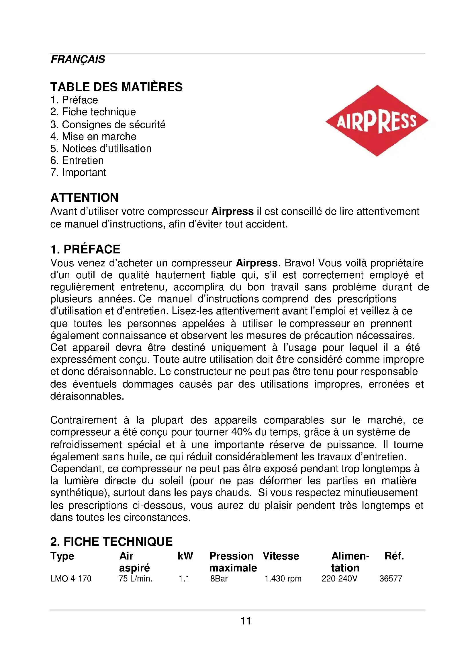 ATTENTION Avant d’utiliser votre compresseur Airpress il est conseillé de lire attentivement ce manuel d’instructions, afin d’éviter tout accident.