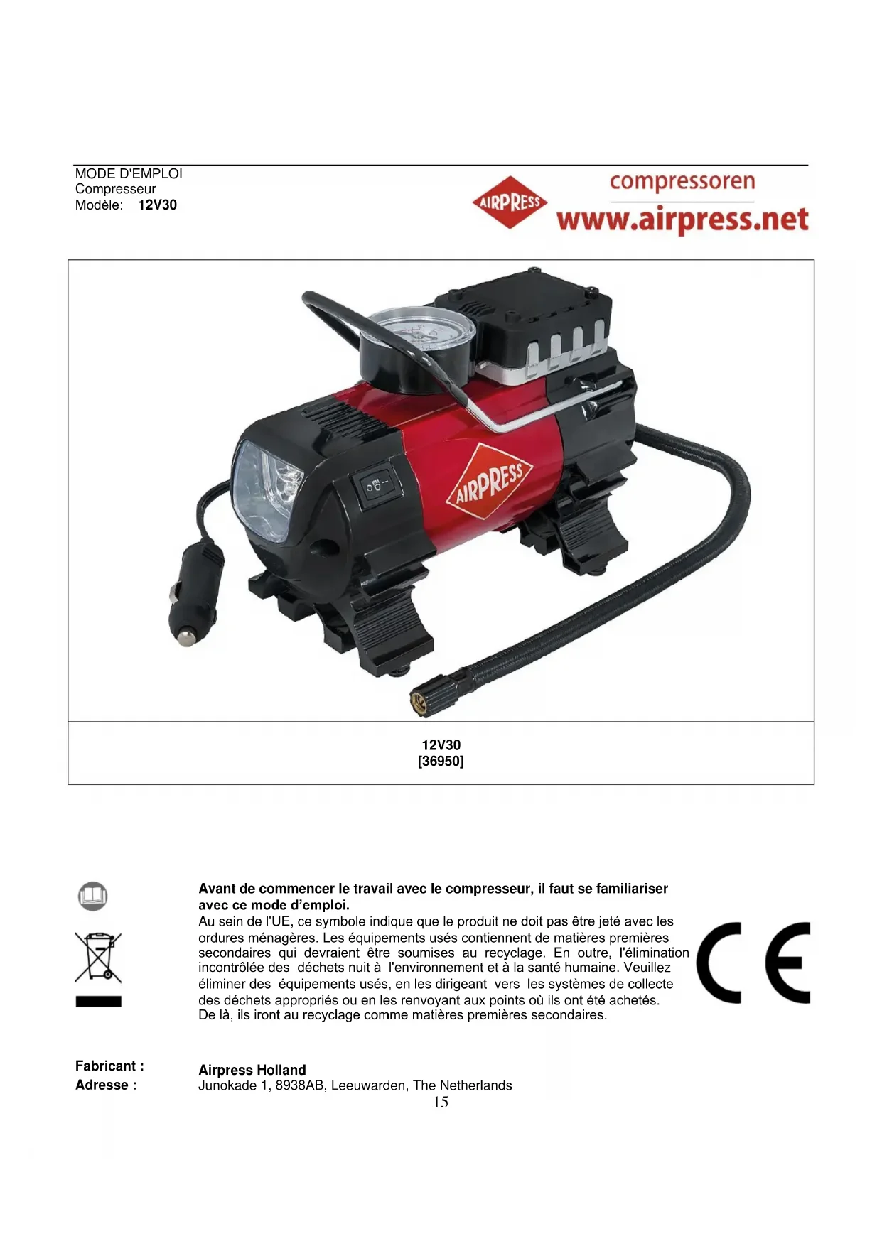 Le délai de garantie de la machine/de I'appareil est de 24 mois, à compter de la date d'acquisition. Au cas ou des difficultés techniques dues à des défauts de matériau ou de construction se présenteraient pendant ce délai, la garantie concernera tant les pièces détachées qua la main-d'oeuvre. On ne pourra prétendre à aucune garantie dans les cas suivants: - Les instructions prévues par la notice n'ont pas été respectées. - La modification de la machine/de I'appareil empêche son fonctionnement, même si les pièces appropriées ont été utilisées. - Dégáts matériels dus au fait que la machine/l'appareil est tombé(e), a gelé(e), heurté(e) quelque chose ou qu'elle (qu'il) a été mal démonté(e), branché(e) incorrectement sur le réseau etc. - Dégáts matériels dus à I'emploi de rallonges faisant moins de 2,5 qmm. Seulement en cas de 230V. Au cas ou la réclamation serait retenue, la machine/l'appareil sera renvoyé(e) franc de port à I'issue des travaux de réparation. Il ne sera accordé aucun dédommagement ultérieur.25 CE-Deklaracja zgodności My, AIRPRESS HOLLAND, Junokade 1, 8938AB, Leeuwarden, Holandia oświadczamy na własną odpowiedzialność, że modele sprężarki: 12V30, której dotyczy niniejsza deklaracja, są zgodne z poniższymi przepisami i normami. EG-verklaring van overeenstemming Wij, AIRPRESS HOLLAND, Junokade 1, 8938AB, Leeuwarden, The Netherlands verklaren geheel onder eigen verantwoordelijkheid dat de producten Compressoren 12V30, waarop deze verklaring betrekking heeft, in overeenstemming zijn met: EG-Konformitätserklärung Wir, AIRPRESS HOLLAND, Junokade 1, 8938AB, Leeuwarden, The Netherlands erklären hiermit, dass die Produkte Kompressoren 12V30, den folgenden Normen und Richtlinien entsprechen: Déclaration CE de conformité Nous, AIRPRESS HOLLAND, Junokade 1, 8938AB, Leeuwarden, The Netherlands déclarons entièrement sous notre propre responsabilité que les produits Compresseurs 12V30, auquel cette déclaration a trait sont conformes: