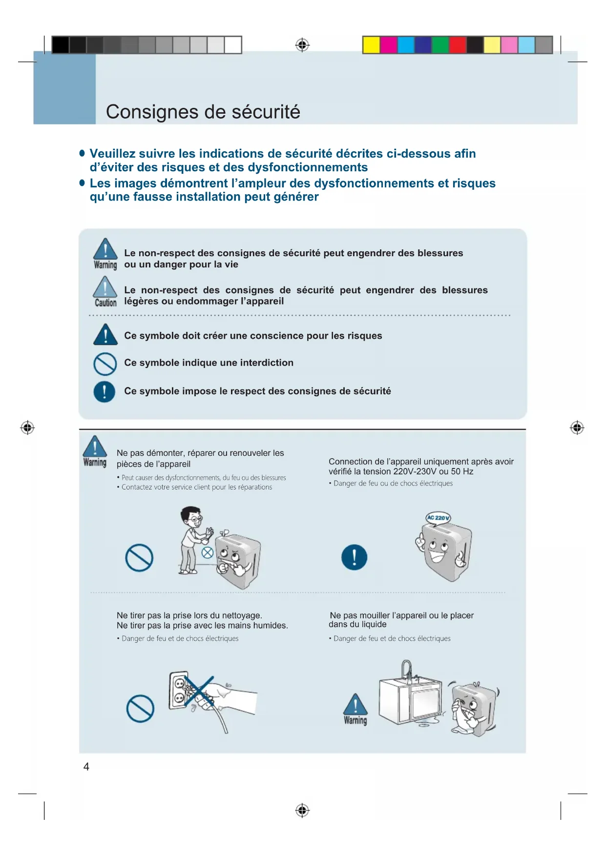 Consignes de sécurité d’éviter des risques et des dysfonctionnements Veuillez suivre les indications de sécurité décrites ci-dessous afin Les images démontrent l’ampleur des dysfonctionnements et risques qu’une fausse installation peut générer Le non-respect des consignes de sécurité peut engendrer des blessures ou un danger pour la vie Le non-respect des consignes de sécurité peut engendrer des blessures légères ou endommager l’appareil Ce symbole doit créer une conscience pour les risques Ce symbole indique une interdiction Ce symbole impose le respect des consignes de sécurité pièces de l’appareil Ne pas démonter, réparer ou renouveler les Connection de l’appareil uniquement après avoir vérifié la tension 220V-230V ou 50 Hz