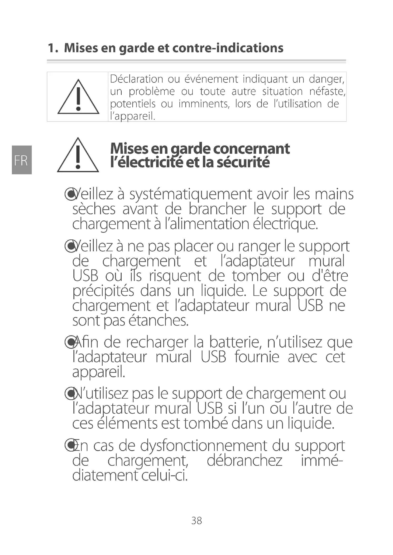 N'utilisez pas le support de chargement ou l'adaptateur mural USB si l'un ou l'autre de ces éléments est tombé dans un liquide.