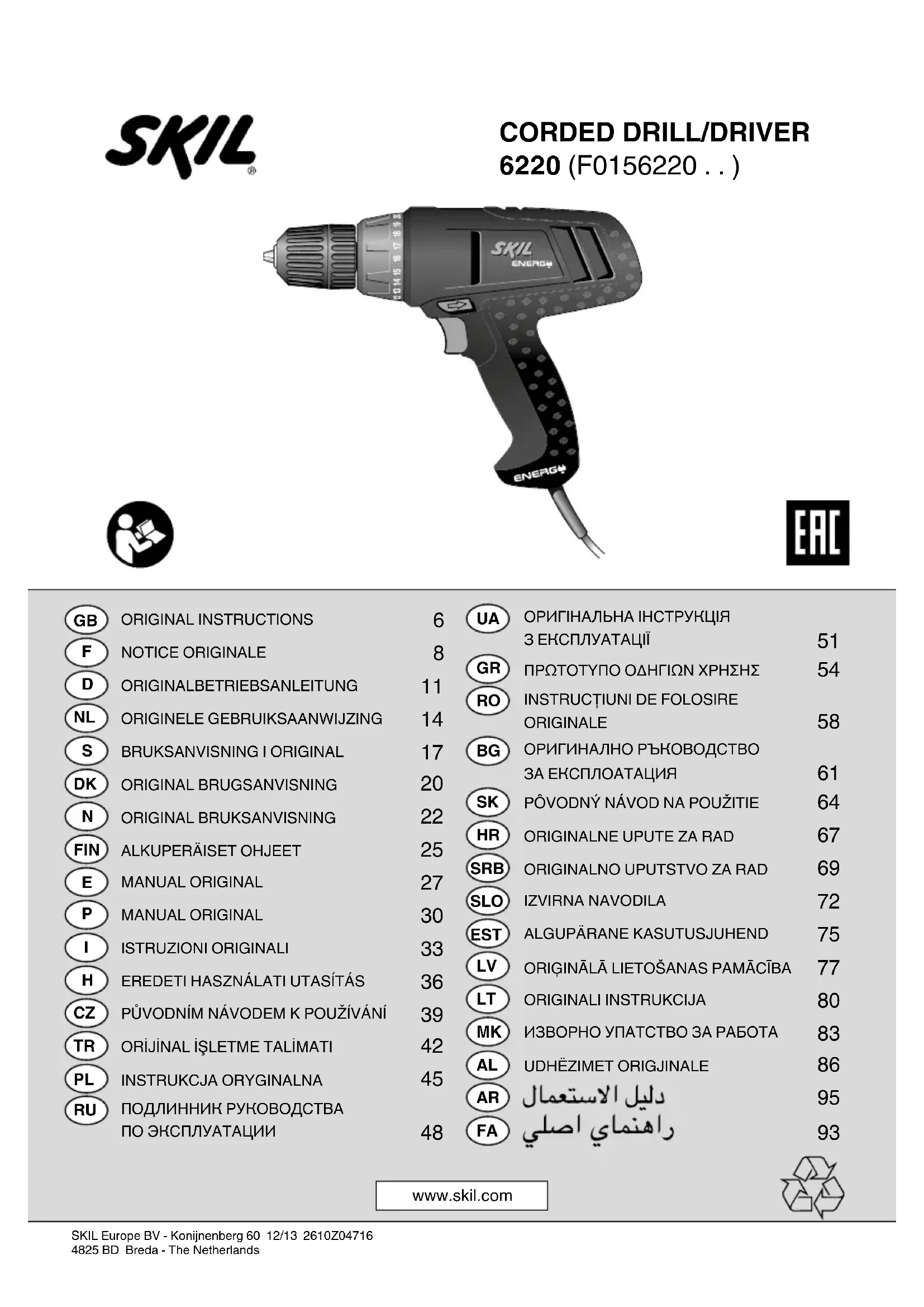 - Si, malgré tous les soins apportés à la fabrication et au contrôle de l’outil, celui ci devait avoir un défaut, la réparation ne doit être conée qu’à une station de service après-vente agréée pour outillage SKIL - retournez l’outil non démonté avec votre preuve d’achat au revendeur ou au centre de service après-vente SKIL le plus proche (les adresses ainsi que la vue éclatée de l’outil gurent sur www.skil.com) ENVIRONNEMENT