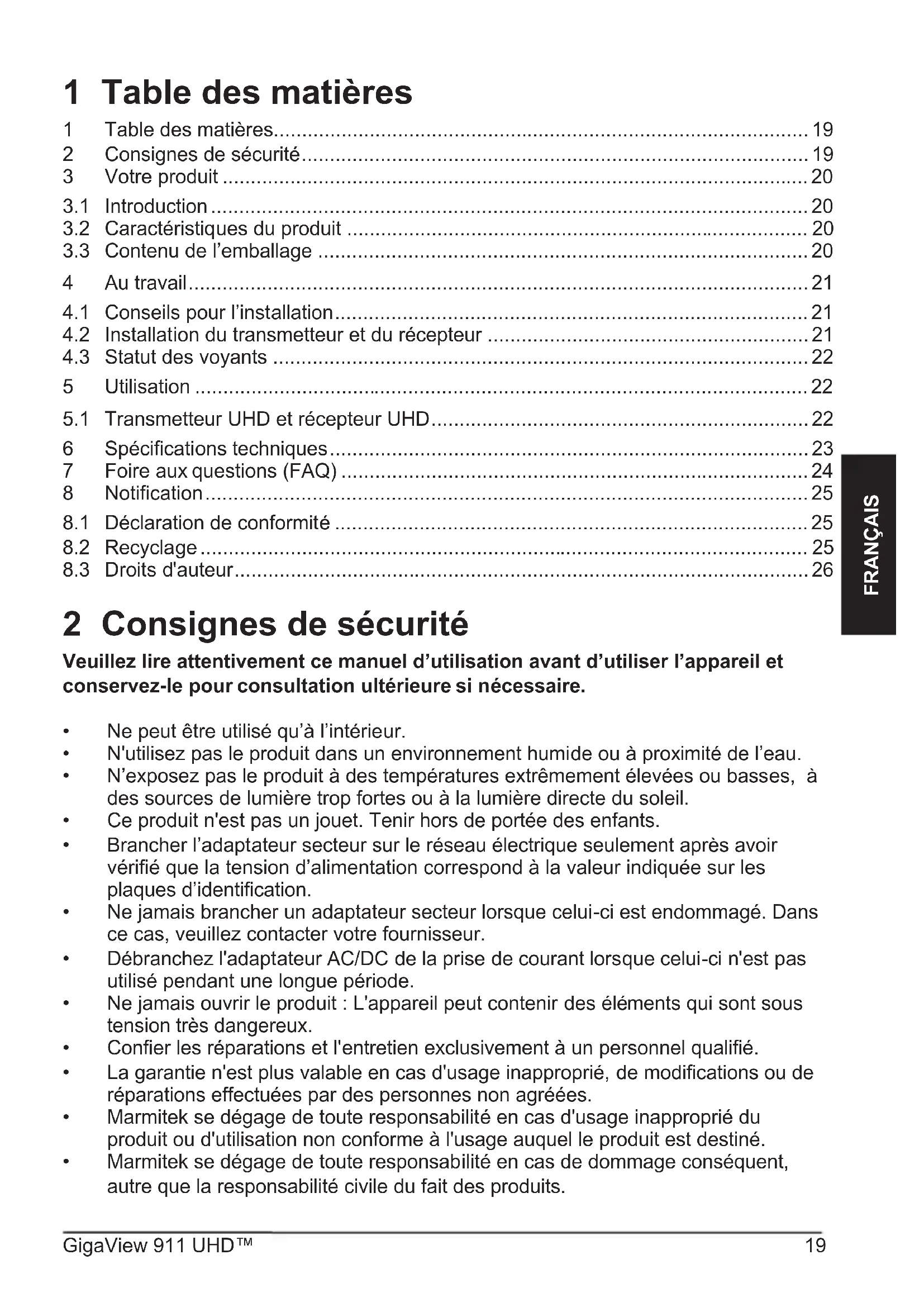 Marmitek est une marque déposée de Germatron BV. GigaView 911 UHD ™ est une marque déposée de Marmitek BV. Tous droits réservés. Tout a été mis en œuvre pour que les informations présentées dans ce manuel soient exactes. Marmitek n’est pas responsable des erreurs de reproduction ou d’impression. Les droits d'auteur et tout autres droits de propriété concernant le contenu (comprenant mais pas limités aux numéros de modèle, logiciels, audio, vidéo, textes et photos) appartiennent à Marmitek B.V. Toute utilisation du contenu, mais sans restriction, concernant la distribution, la reproduction, toute modification, la publication ou la diffusion est strictement interdite sans l'autorisation préalable par écrit de Marmitek. Tous les droits d'auteur et autres droits de propriété doivent être respectés pour toutes reproductions. Les autres noms de produits et de sociétés peuvent être des marques de leurs détenteurs respectifs. Les produits commercialisés par des entreprises tierces ne sont mentionnés que pour information, sans aucune intention de préconisation ni de recommandation. Marmitek décline toute responsabilité quant à l’utilisation et au fonctionnement de ces produits. Marmitek BV - Boîte postale 4257 - 5604 EG Eindhoven Pays-BasGigaView 911 UHD™