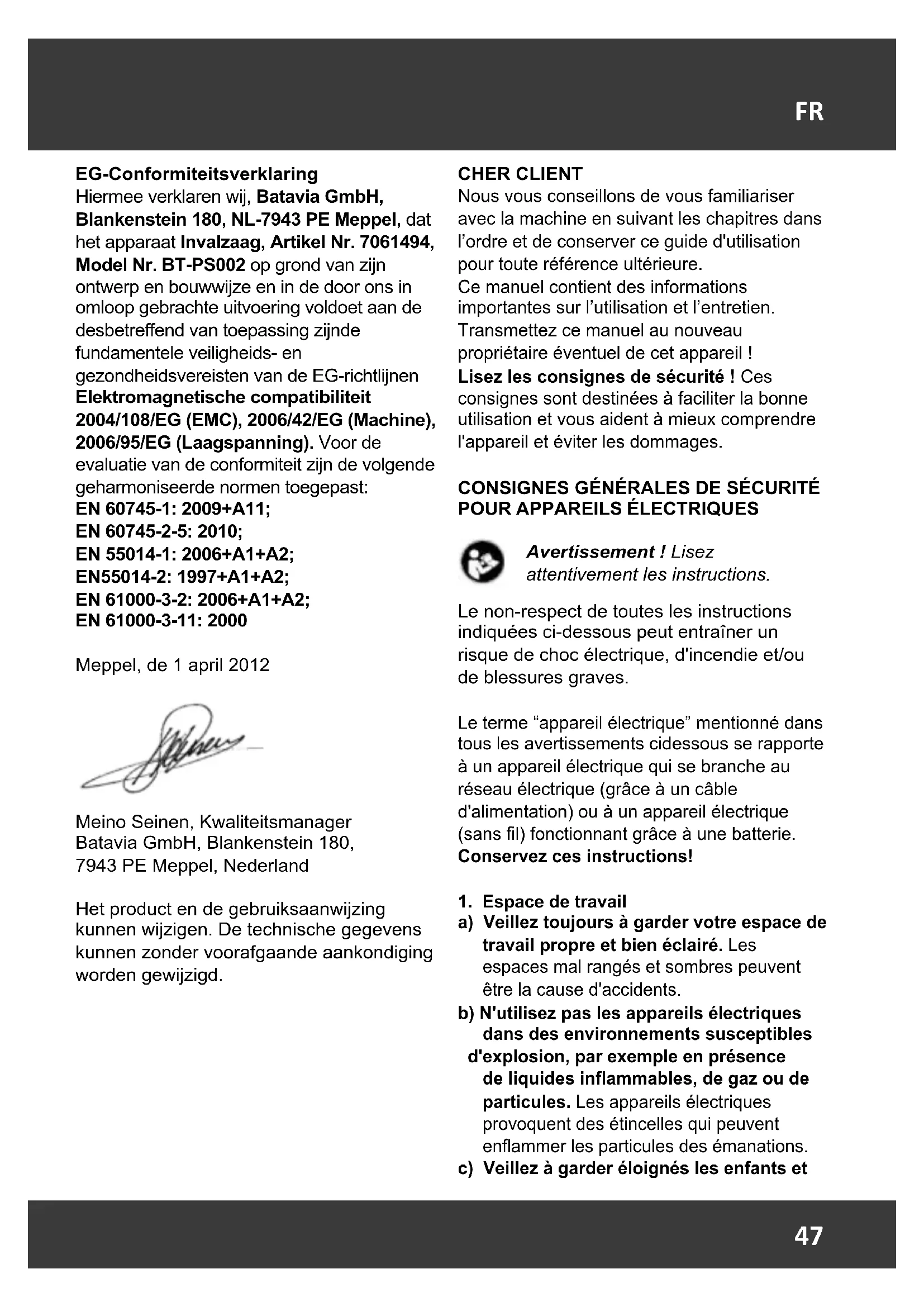composés de plusieurs matériaux, par exemple des métaux et des matières plastiques. Éliminez les composants défectueux via les systèmes d’élimination des déchets spéciaux. Renseignez-vous dans un magasin spécialisé ou auprès de l’administration de votre commune! CE-Déclaration de conformité Nous, Batavia GmbH, Blankenstein 180, NL-7943 PE Meppel, déclarons sous notre seule responsabilité que le produit Scie plongeante, article no. 7061494, modèle BT-PS002, satisfait les principales exigences de protection dénies dans les directives européennes compatibilité électromagnétique 2004/108/CE (CEM), 2006/42/CE (machines) et 2006/95/CE (basse tension) ainsi que les modications y apportées. Pour évaluer la conformité nous avons eu recours aux normes harmonisées ci-dessous: EN 60745-1: 2009+A11, EN 60745-2-5: 2010, EN 55014-1: 2006+A1, EN55014-2: 1997+A1+A2, EN 61000-3-2: 2006+A1+A2, EN 61000-3-3: