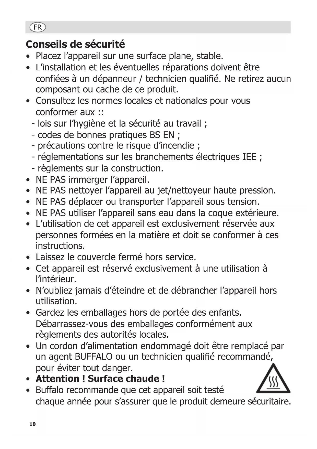 - Buffalo recommende que cet apparéil soit testé chaque année pour s'assurer que le produit demeure sécuritaire.