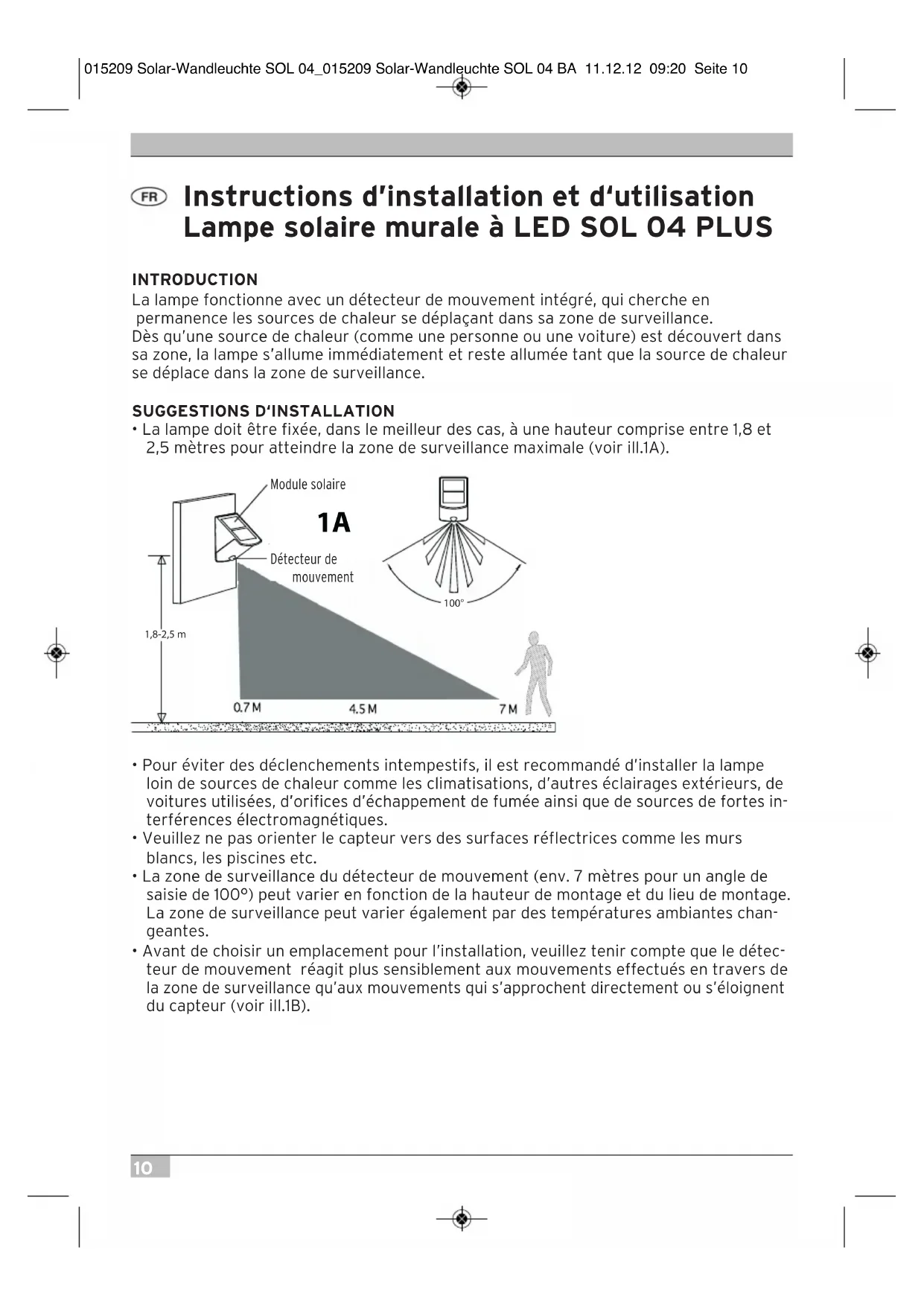 Incorrect disposal of batteries rechargeable batteries can harm the environment! Batteries and rechargeable batteries do not belong in the household waste. They can contain poisonous heavy metals and are subject to treatment as hazardous wastes. Take your used batteries to a municipal collection site. 015209 Solar-Wandleuchte SOL 04_015209 Solar-Wandleuchte SOL 04 BA 11.12.12 09:20 Seite 910 Instructions d’installation et d‘utilisation Lampe solaire murale à LED SOL 04 PLUS INTRODUCTION La lampe fonctionne avec un détecteur de mouvement intégré, qui cherche en permanence les sources de chaleur se déplaçant dans sa zone de surveillance. Dès qu’une source de chaleur (comme une personne ou une voiture) est découvert dans sa zone, la lampe s’allume immédiatement et reste allumée tant que la source de chaleur se déplace dans la zone de surveillance.