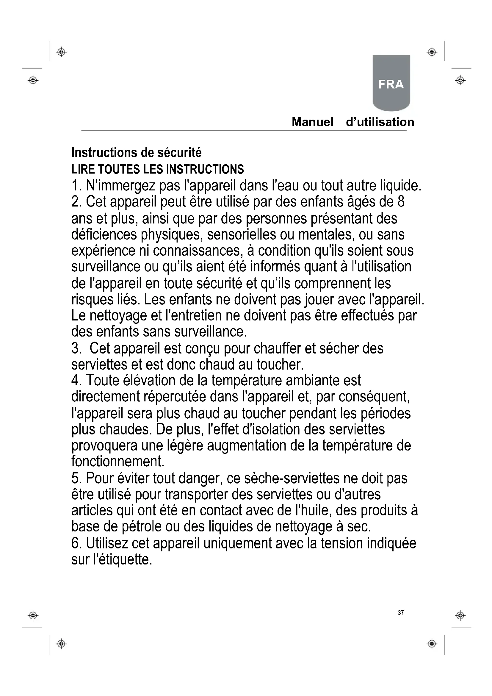 5. Pour éviter tout danger, ce sèche-serviettes ne doit pas