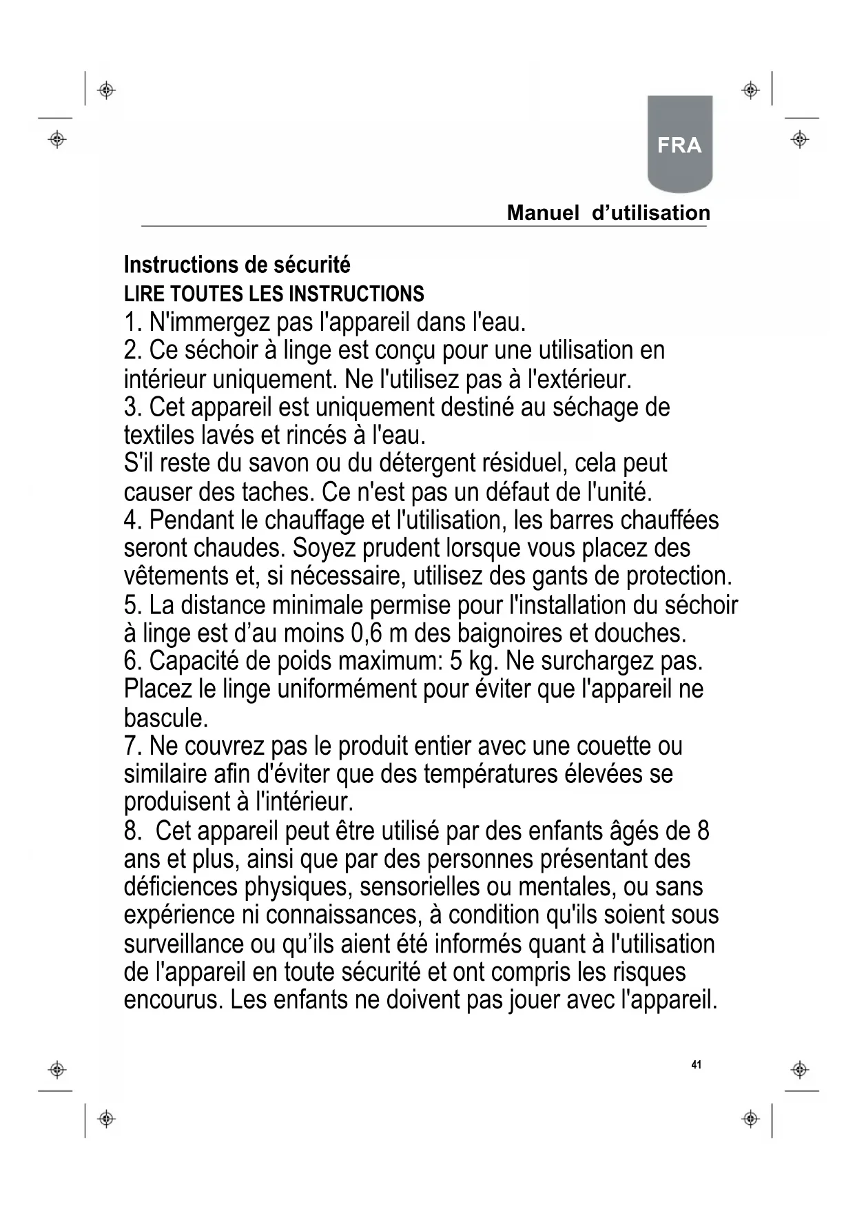 ans et plus, ainsi que par des personnes présentant des déficiences physiques, sensorielles ou mentales, ou sans expérience ni connaissances, à condition qu'ils soient sous surveillance ou qu’ils aient été informés quant à l'utilisation de l'appareil en toute sécurité et ont compris les risques encourus. Les enfants ne doivent pas jouer avec l'appareil. FRA Manuel d’utilisation42 Le nettoyage et l'entretien ne doivent pas être effectués par des enfants sans surveillance.